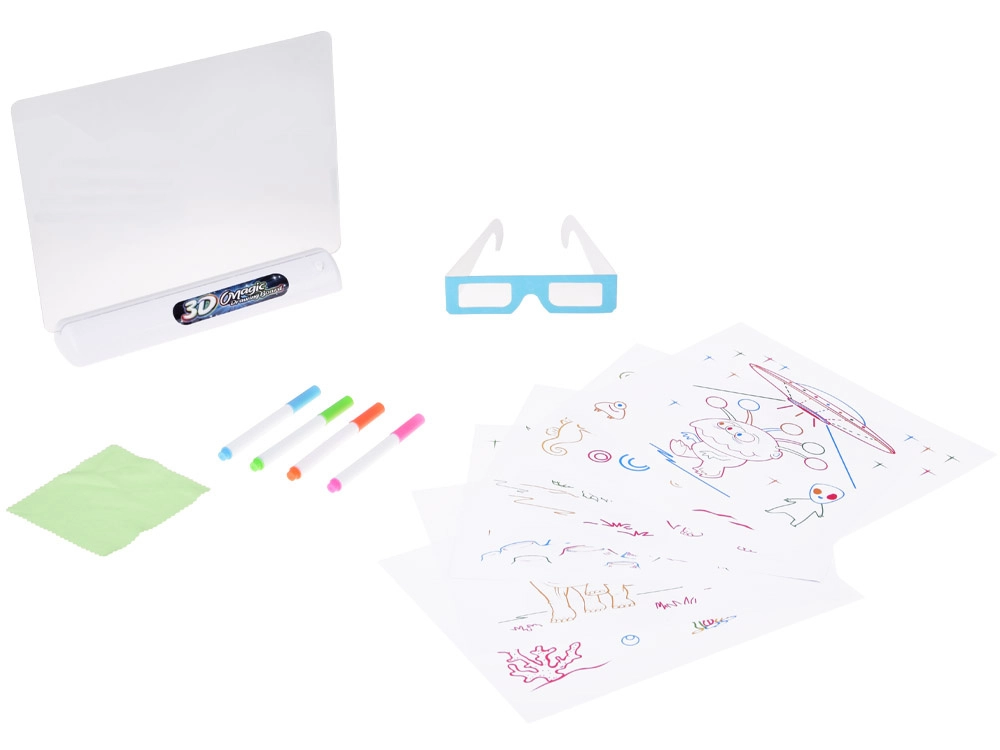 - 1× panou transparent pe suport, 1× panou luminos în bază, 4× marker fluorescent (verde, albastru, portocaliu, roz), 6× șablon față-verso (motiv marin), 1× ochelari 3D, 1× lavetă de curățare