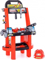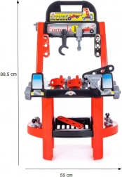 Setul pentru micii meșteri include o masă de lucru compactă cu raft sub blatul de lucru și un cârlig pentru agățarea uneltelor în partea superioară. Sunt incluse șurubelniță, cheie franceză, piese plate pentru înșurubare, șuruburi și piulițe, clești de răsucire, menghină și cască de protecție. Face parte din set și un set de autocolante pentru un aspect atrăgător al întregului atelier.