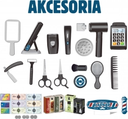 - placă de păr, 2× foarfece, pieptene, perie, oglindă, brici, bol și pensulă pentru spumă, suport pentru placă