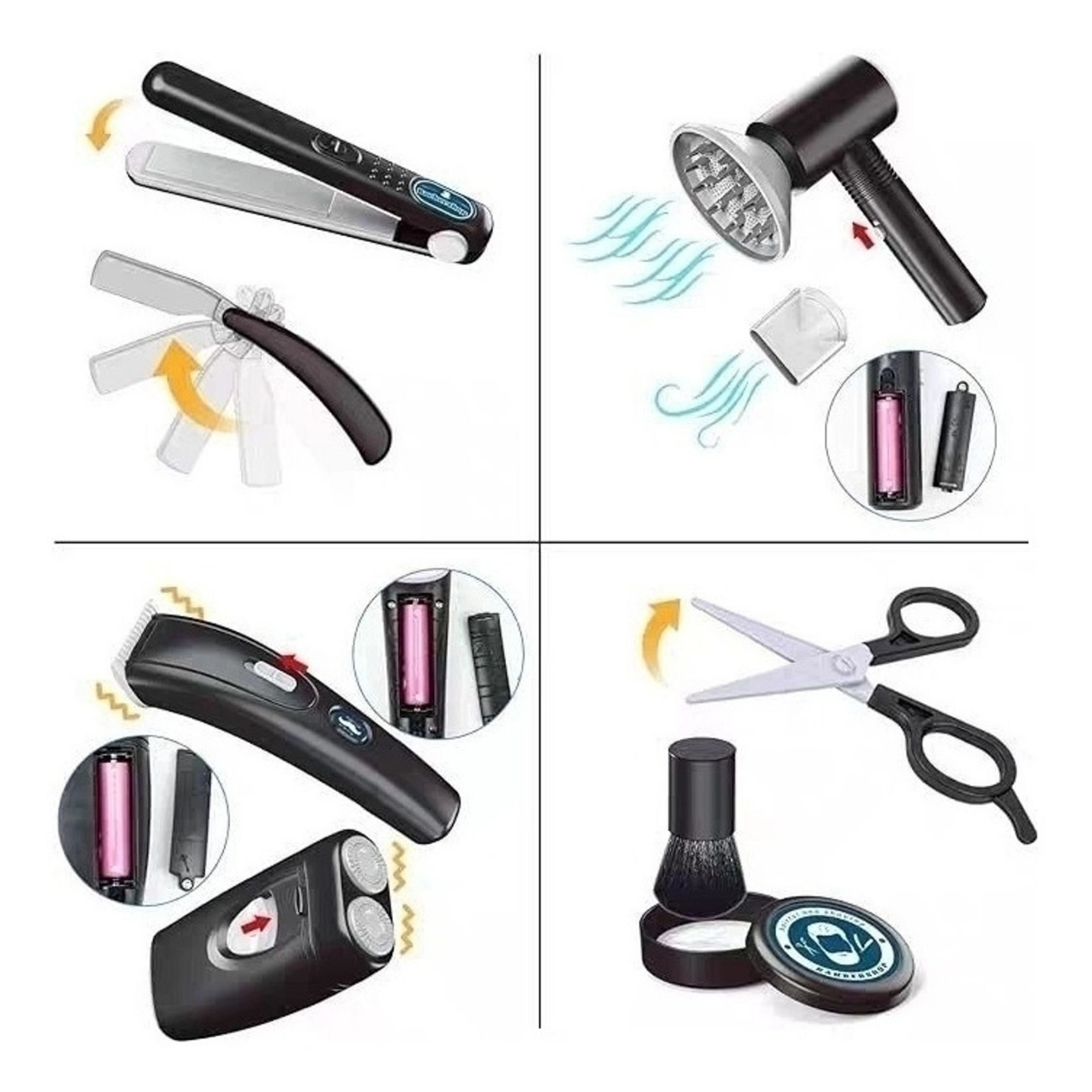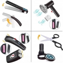- Dotare bogată, 24 piese: capete, foarfece, piepteni, placă de păr, oglindă, brici și altele.