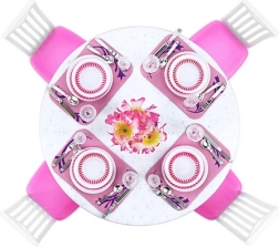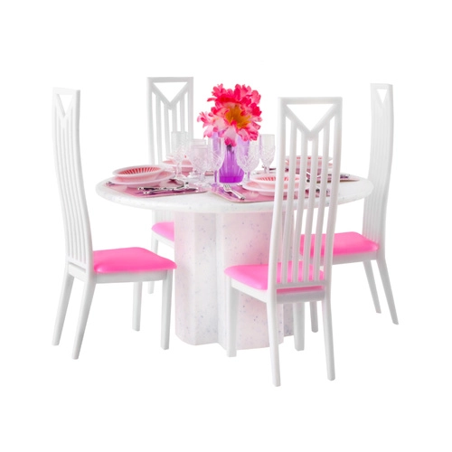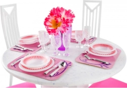 Masă rotundă, patru scaune și un set complet de veselă și tacâmuri. Totul asortat în roz‑alb pentru servire realistă și o prezentare frumoasă.