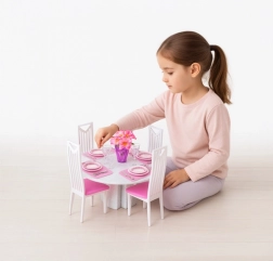 Transformă jocul de-a casa într-o distracție și mai mare cu o sufragerie stilată pentru păpuși. Acest set complet cu 43 de piese include o masă rotundă, 4 scaune și o bogată garnitură de masă în combinație delicată roz‑alb. Datorită materialelor sigure și rezistente și asamblării rapide, este ideal pentru joacă creativă, dezvoltarea motricității fine și a abilităților sociale ale copiilor.