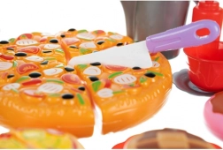 Feliile de pizza sunt unite cu arici – copiii le pot separa cu cuțitul din plastic și le pot uni din nou. Joacă realistă fără dezordine care susține motricitatea fină.