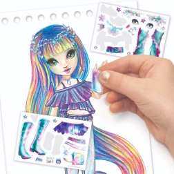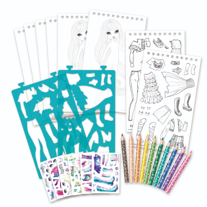 Setul conține 20 de pagini pretipărite cu siluetă, 2 pagini de șabloane cu 28 de elemente de îmbrăcăminte, 6 coli de autocolante (100 buc.), 10 creioane colorate și ghid ilustrat. Copiii pot contura ținutele folosind șabloanele, colora și decora cu autocolante pentru combinații de modă unice.
