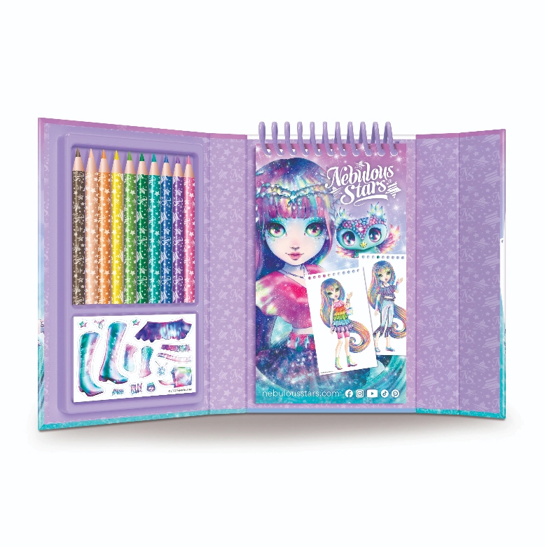 Descoperă lumea creativității cu setul compact Nebulous Stars, ideal pentru călătorii. Acest bloc practic cu închidere magnetică oferă 20 de pagini cu siluetă, șabloane pentru proiectarea ținutelor, 6 coli de autocolante, 10 creioane colorate și un ghid ilustrat – tot ce au nevoie copiii pentru fantezie, modă și desen oriunde.