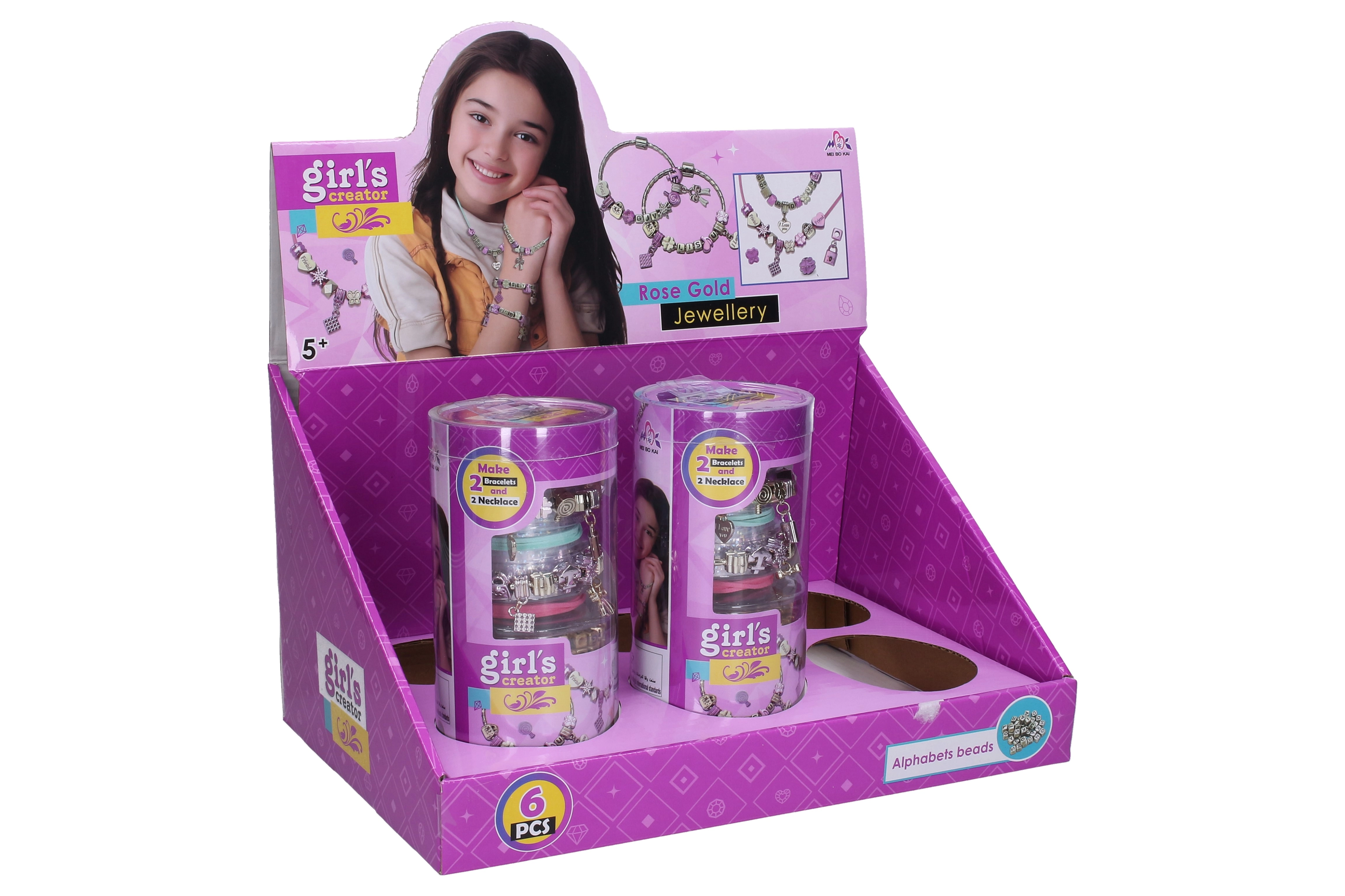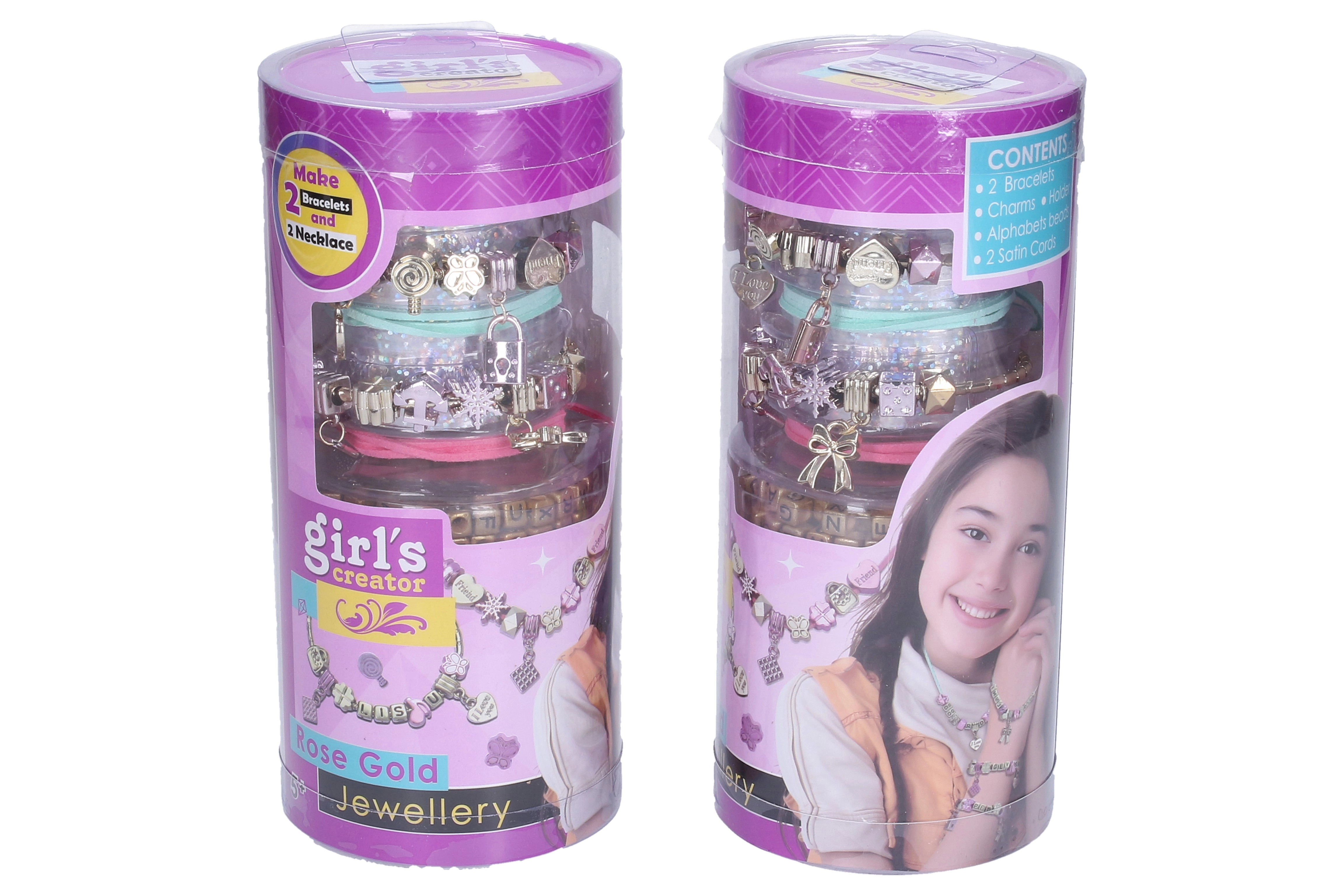 Acest set creativ va încânta toate micile creatoare de bijuterii. În pachet găsești tot ce ai nevoie pentru realizarea unor brățări și coliere stilate, în elegantul ton rose gold – de la pandantive în formă de inimioare, steluțe și fundițe până la mărgele cu litere pentru realizarea numelor și mesajelor.