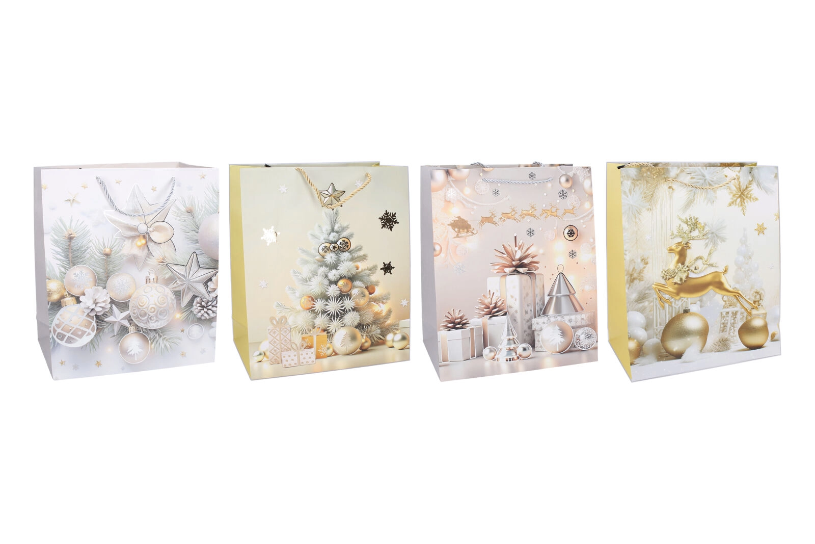 Pungă cadou elegantă, mărimea L, pentru o împachetare festivă plină de bucurie. Ideală pentru cadouri de mărime medie până la mari, cu motive de Crăciun pentru o atmosferă perfectă. Disponibilă în 4 variante, cu dimensiuni practice de 31 × 40 × 12 cm și o execuție rezistentă pentru transport în siguranță.