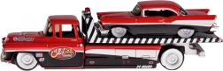 Camionul de remorcare CHEVROLET Flatbed 1957 este echipat cu o rampă de transport detaliată, care reproduce fidel transportul real al unui vehicul clasic.