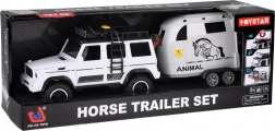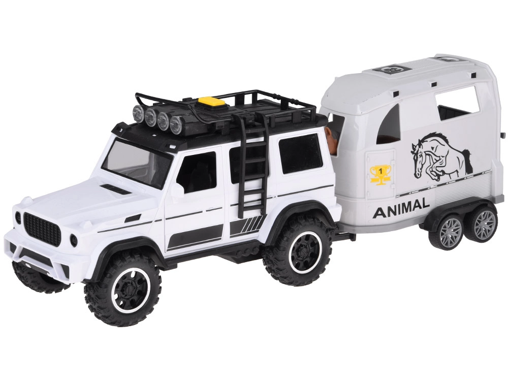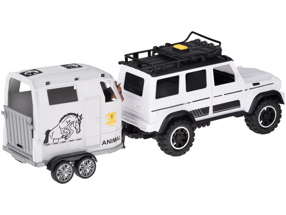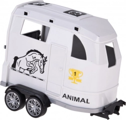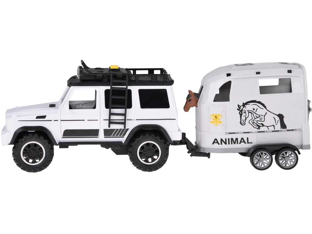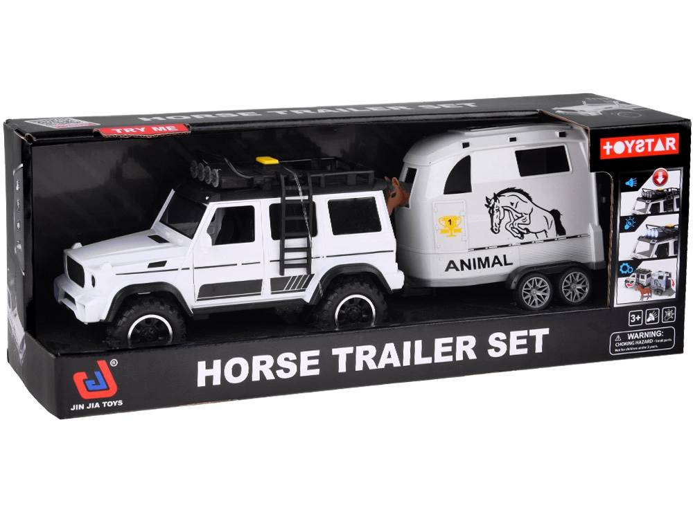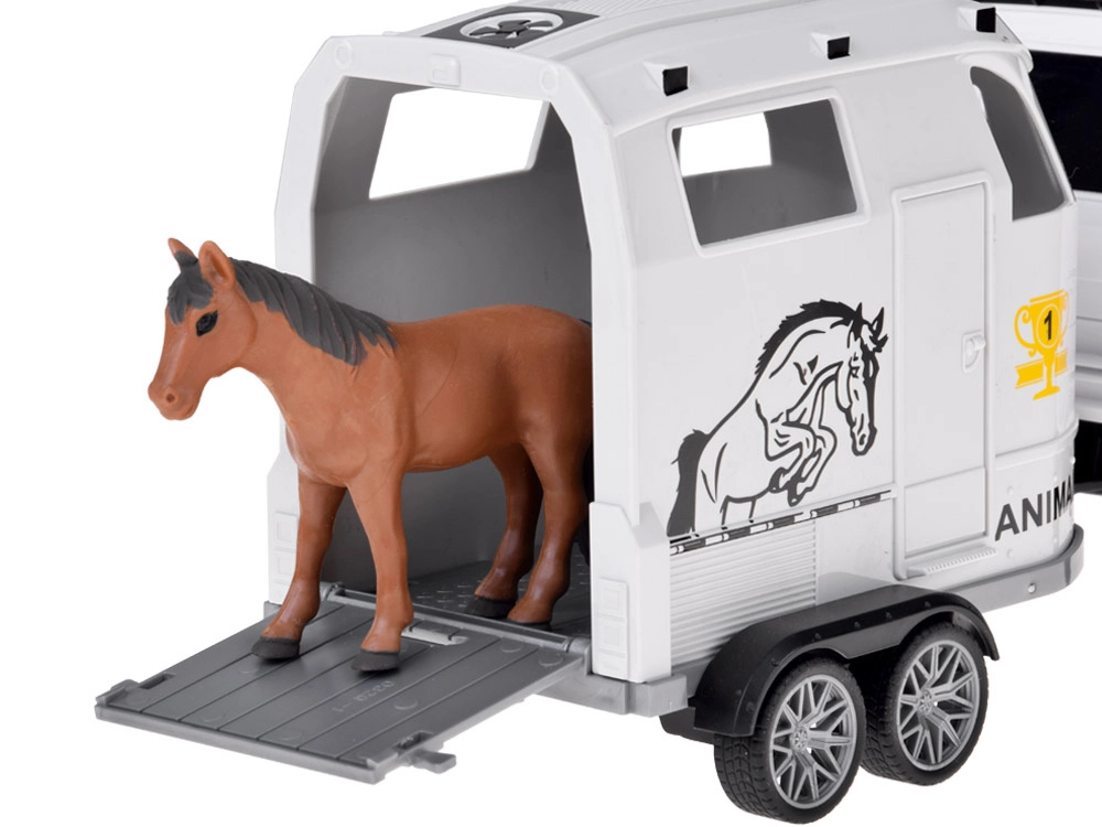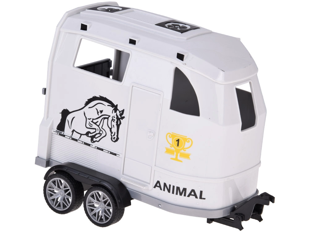 Remorca pentru cai are ferestre, grafică cu cal și, mai ales, o rampă spate deschizabilă pentru încărcarea și descărcarea facilă a figurinei. Datorită cuplajului detașabil, remorca se poate atașa sau detașa ușor, extinzând scenariile de joc – de la fermă până la concursuri ecvestre.