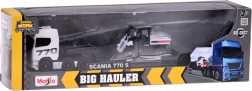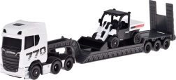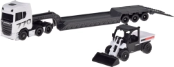 Descoperiți ansamblul realist SCANIA 770S cu semiremorcă low-loader și încărcător funcțional, care impresionează prin redarea fidelă a detaliilor și combinația atractivă alb‑gri. Șasiul metalic al cabinei și piesele din plastic de calitate ale trenului de rulare asigură rezistență chiar și la joacă frecventă.