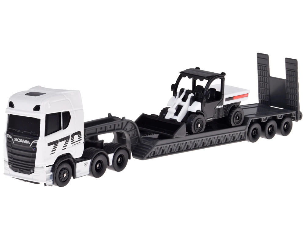 Set model licențiat la scară 1:64 care aduce SCANIA 770S cu semiremorcă low-loader și un încărcător compact. Datorită caroseriei metalice, detaliilor precise și ansamblului detașabil, este ideal atât pentru colecționari, cât și pentru joaca creativă a copiilor.