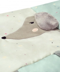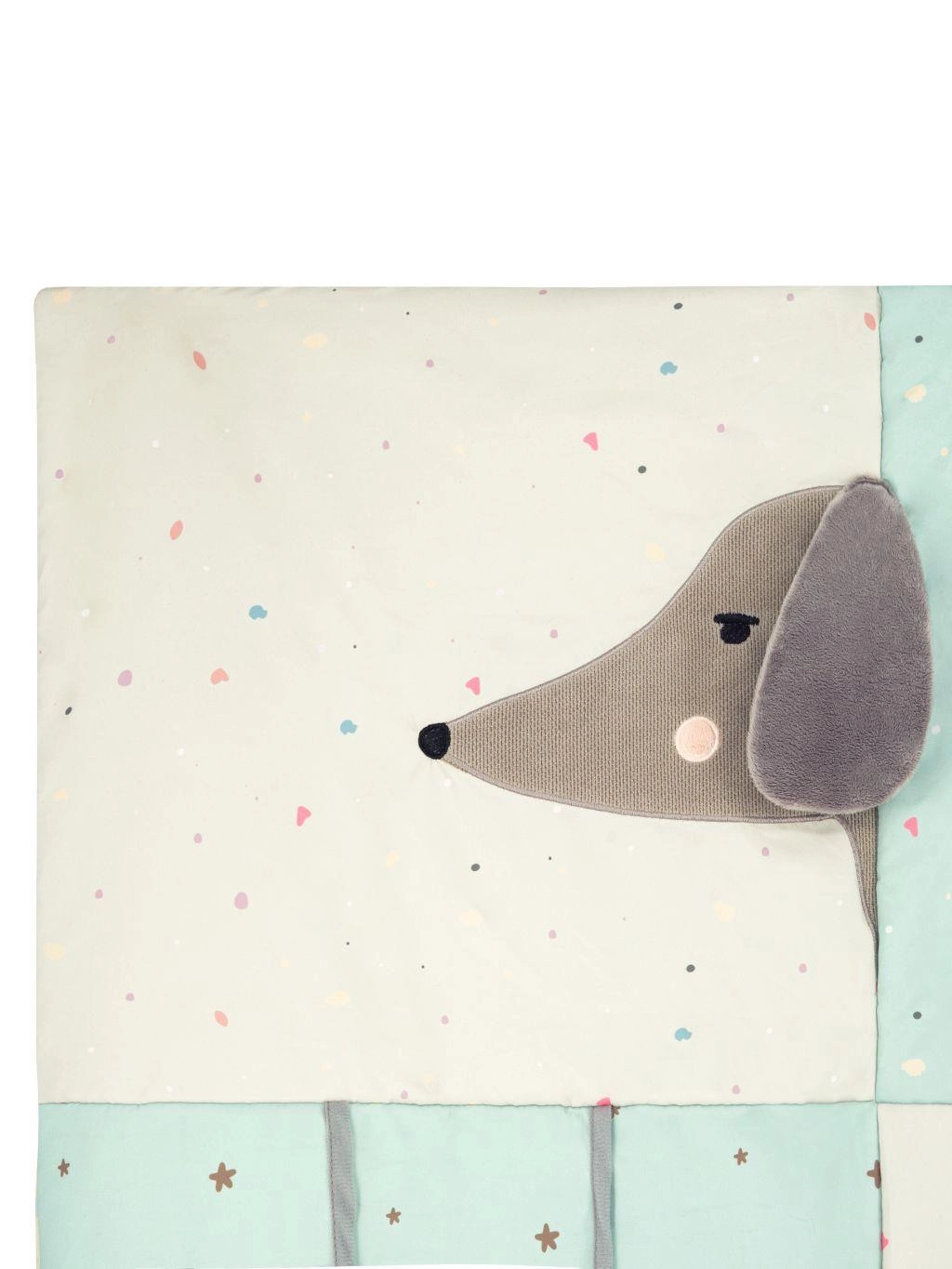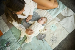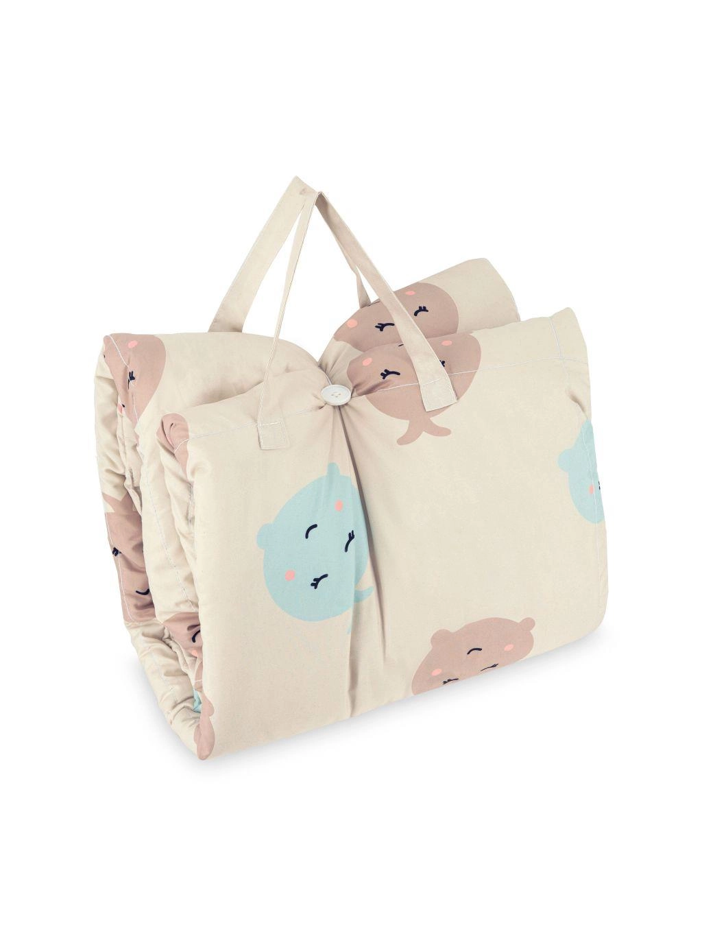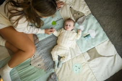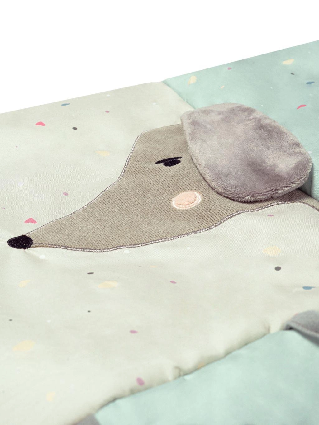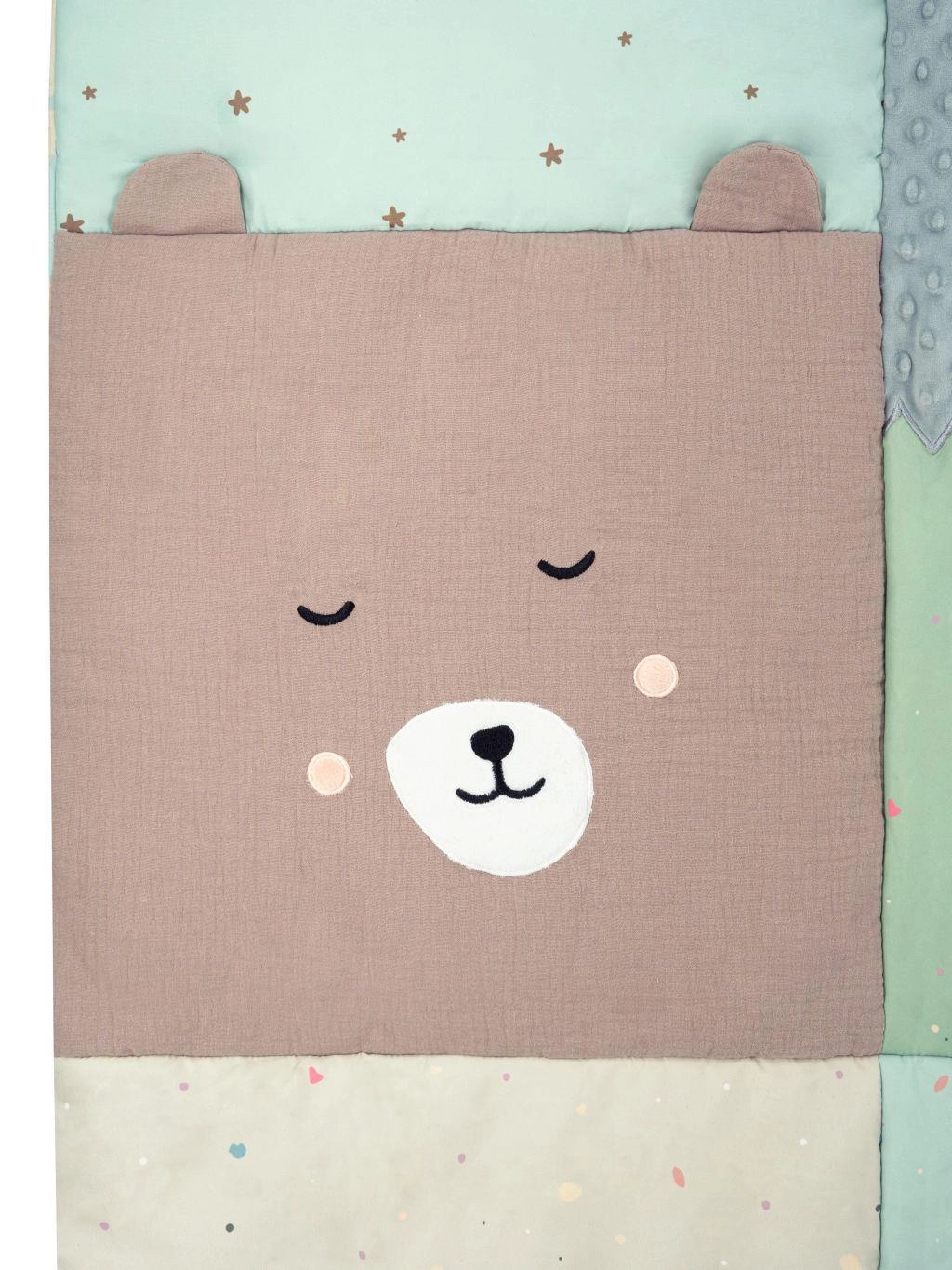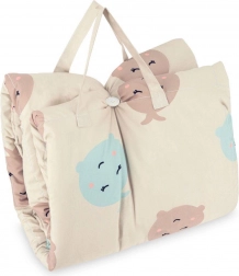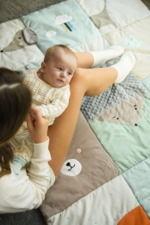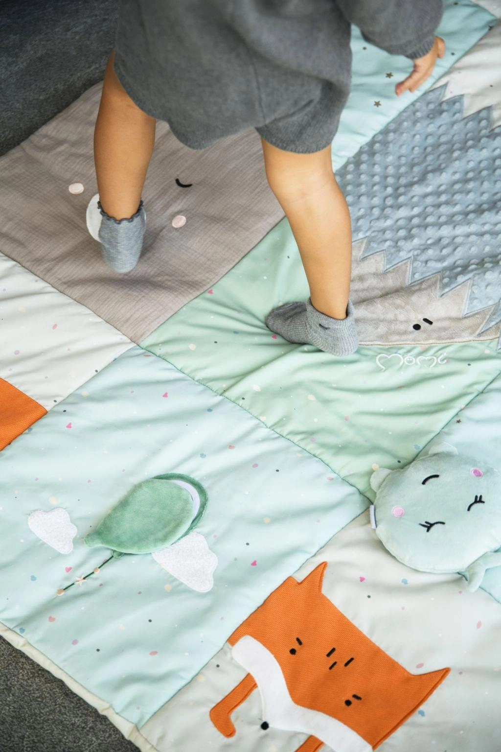 Construcția practică permite pliarea într-o geantă și asigurarea cu nasturi – astfel o poți transporta ușor la picnic, în parc sau la plajă. Culorile blânde și atenuate nu distrag atenția și ajută copilul să perceapă elementele individuale, precum animăluțele și simpaticii ursuleți MoMi. Produsul respectă standardele EN 71-1/2/3 și este potrivit pentru copii încă de la naștere.