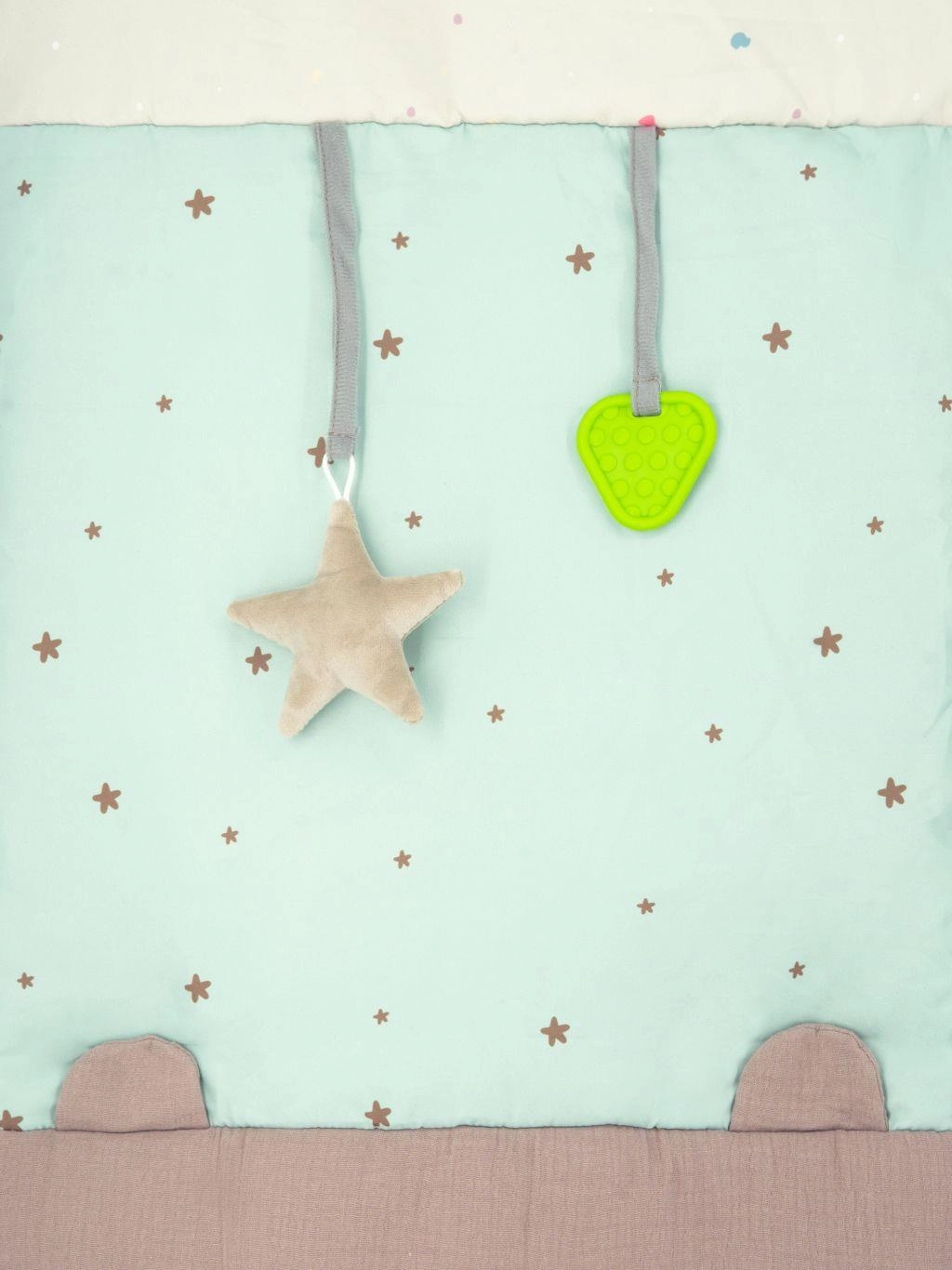 - Dotare senzorială bogată – oglindă în balon, nas de ursuleț cu pârâitoare, ureche de cățel foșnitoare, inel de dentiție și jucării pufoase.