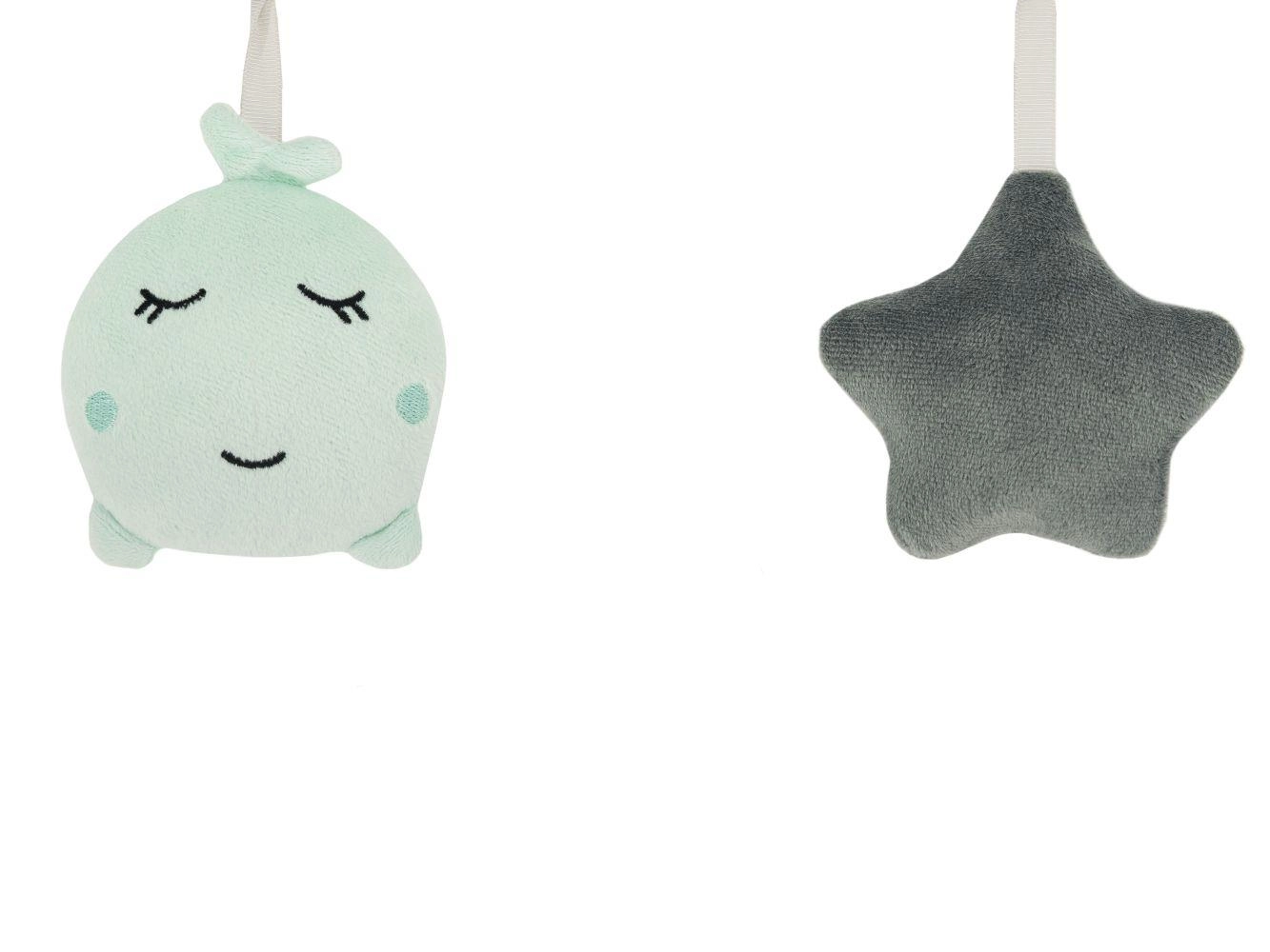 Două jucării suspendate stimulează explorarea, iar melodiile plăcute ajută la calmarea și distragerea bebelușului.