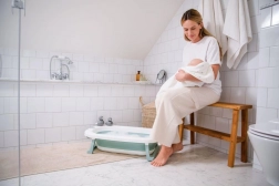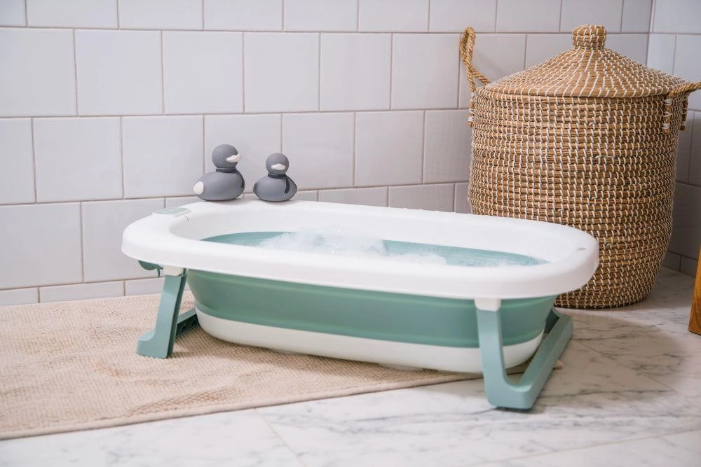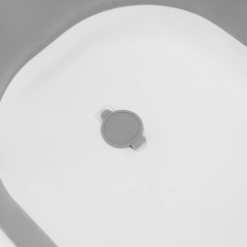 Picioarele rabatabile cu tampoane din cauciuc previn alunecarea și mențin cădița fixă pe loc. Astfel, îi faceți baie copilului confortabil și în siguranță.