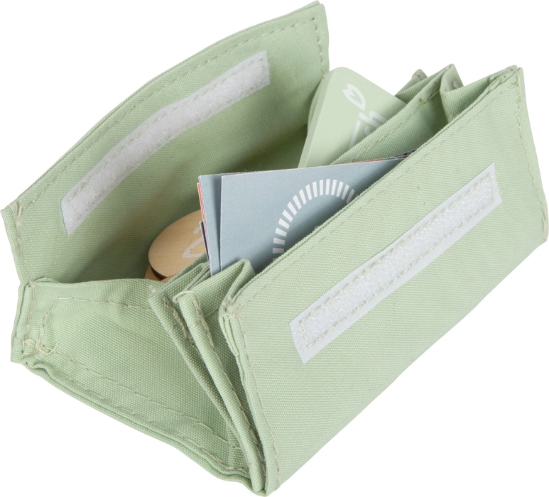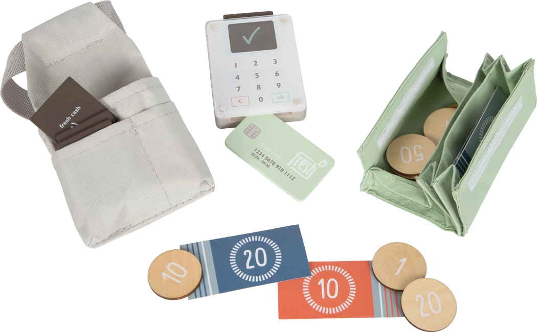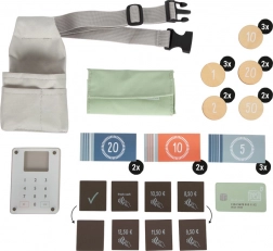 Borsetă cu portofel, bani de jucărie și cititor de carduri le permite copiilor să accepte „plăți”, să emită chitanțe și să exerseze abilitățile sociale.