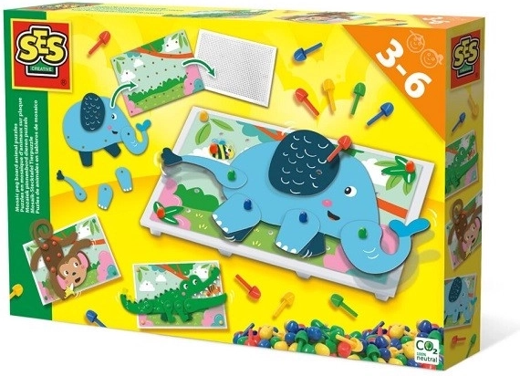 Mozaica creativă – animăluțe oferă un joc isteț ce îmbină asamblarea de puzzle cu introducerea pinuților. Copiii creează un elefant, o maimuță, un crocodil și alți locuitori ai junglei și îi pun în mișcare datorită îmbinărilor mobile. Excelentă pentru joaca de acasă și pentru ateliere creative.