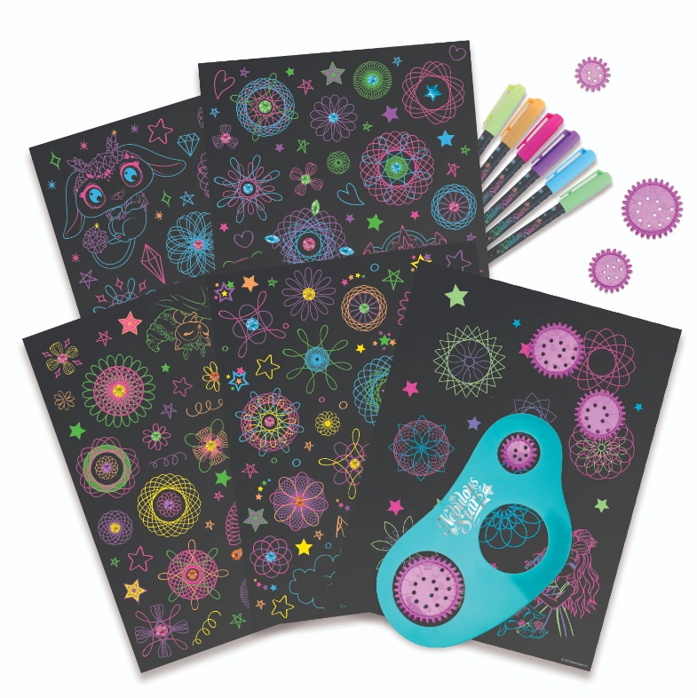 - Ușor și distractiv – introduce rotița în șablon, desenează cu un pix neon și privește cum apar spirale fascinante.