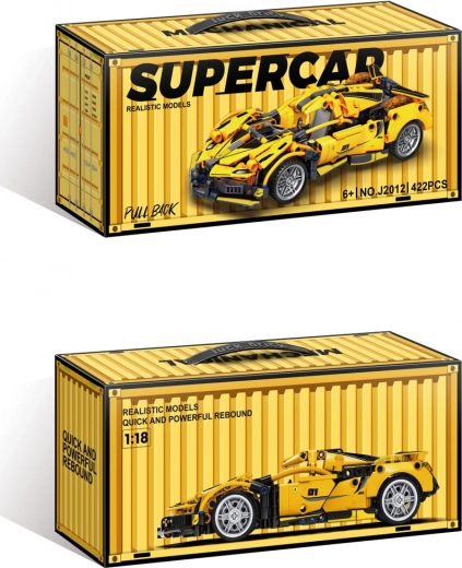 Mașină sport galbenă din set de construcție pentru copii de la 6 ani, cu 422 piese, design realist la scara 1:18, anvelope din cauciuc și distractivul mecanism pull-back pentru o cursă sprintenă. Construcție solidă și rezistentă, cutie colorată cu mâner – un cadou grozav pentru micii constructori.