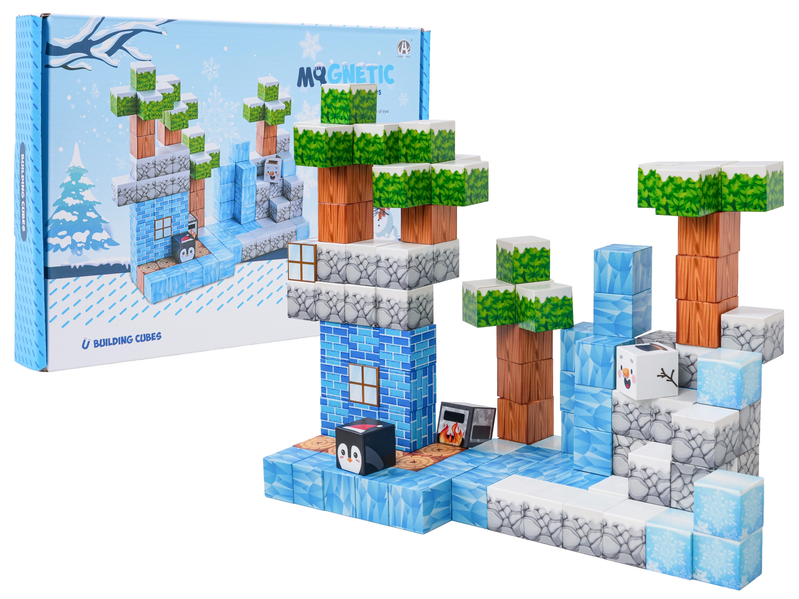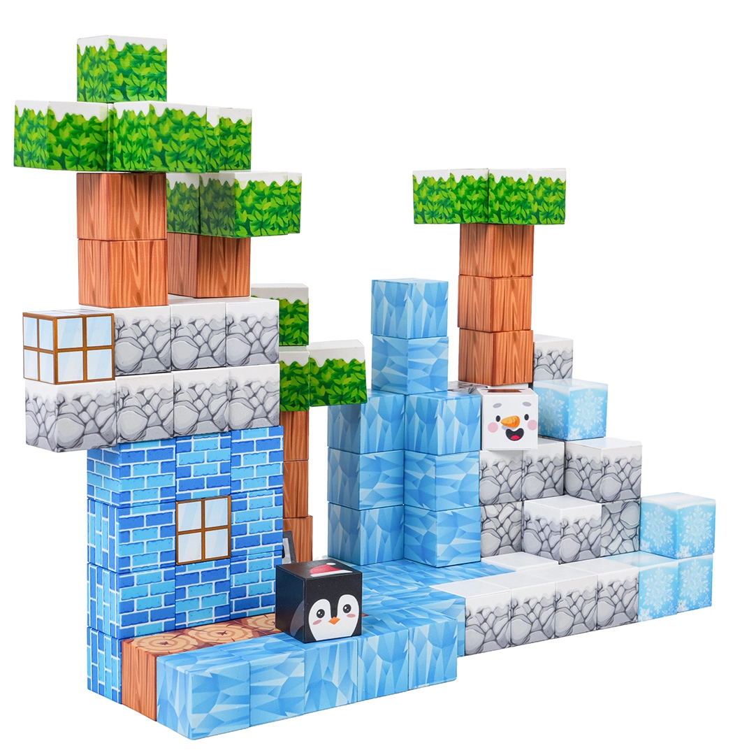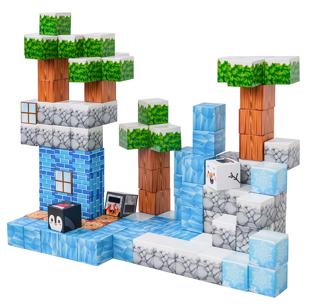 Această bogată setă de construcție oferă copiilor posibilități nelimitate de construit – de la scene de iarnă până la terenuri și structuri originale. Piesele cu texturi imprimate (gheață, lemn, piatră, cărămizi, vegetație) se conectează sigur și ferm datorită magneților neodim, astfel încât modelele își păstrează forma chiar și în timpul jocului prelungit.