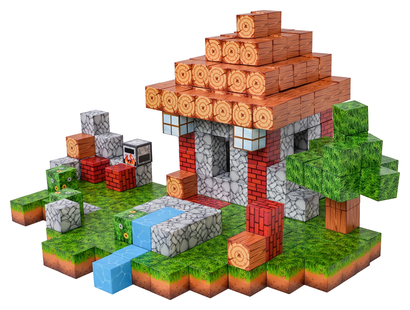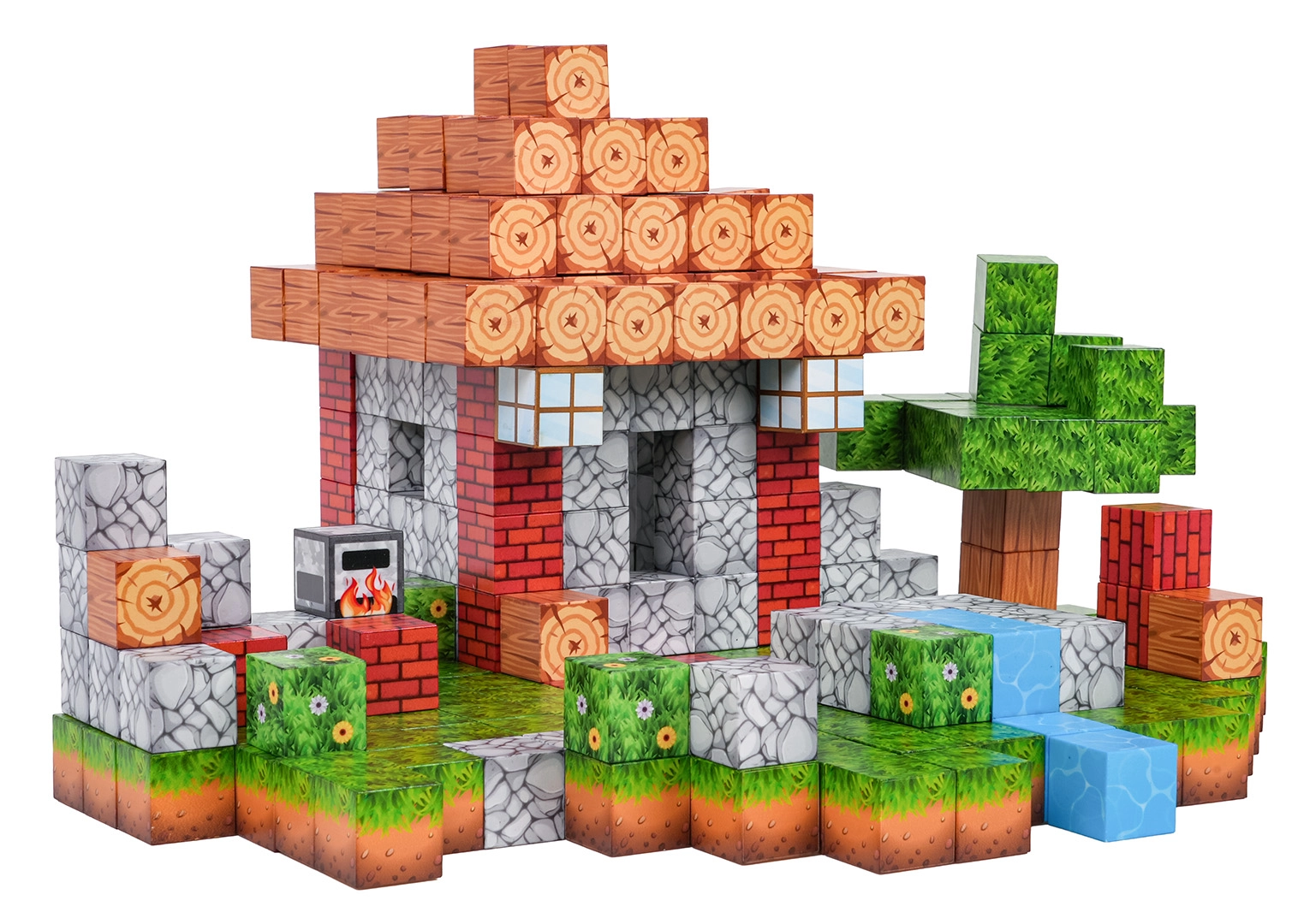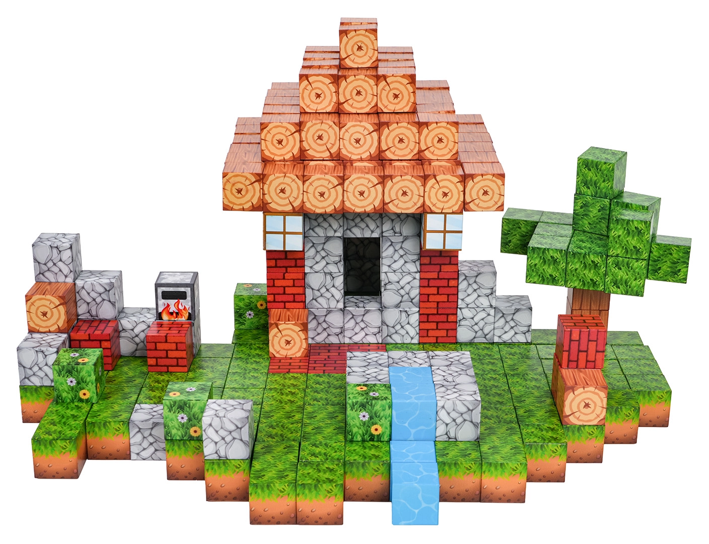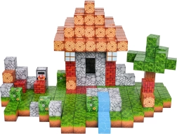 Imprimeurile de lemn, cărămidă, piatră, iarbă și apă oferă detalii construcțiilor. Cuburile se conectează și se reconfigurează ușor pentru idei noi.