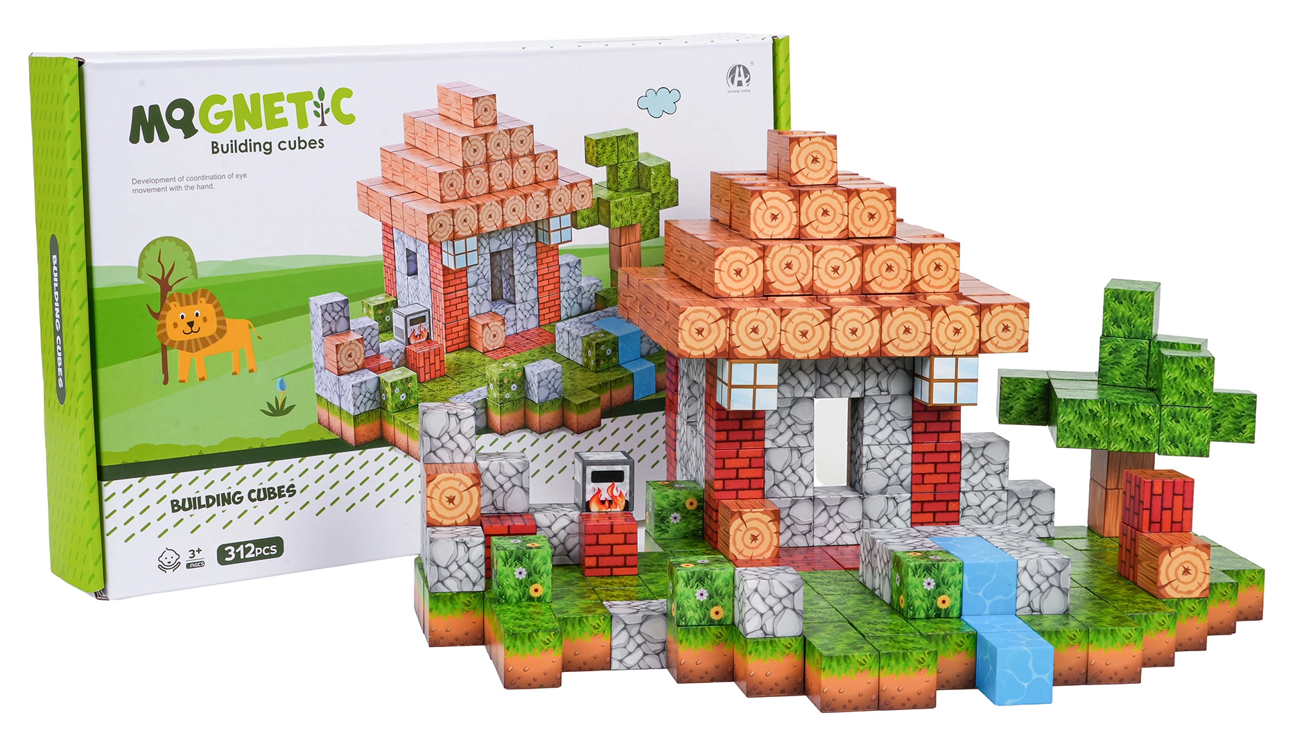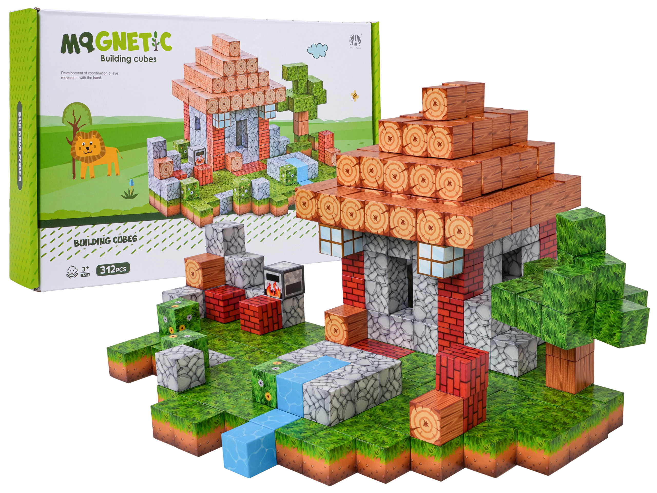 Acest set bogat de cuburi magnetice oferă 312 piese cu imprimeuri realiste ale suprafețelor, precum lemn, piatră, iarbă sau apă. Copiii creează cu ușurință căsuțe, copaci, pârâiașe și peisaje pixelate întregi, pe care le pot reamenaja oricând. Magneții neodim puternici mențin elementele ferm împreună, astfel încât construcțiile sunt stabile și sigure.