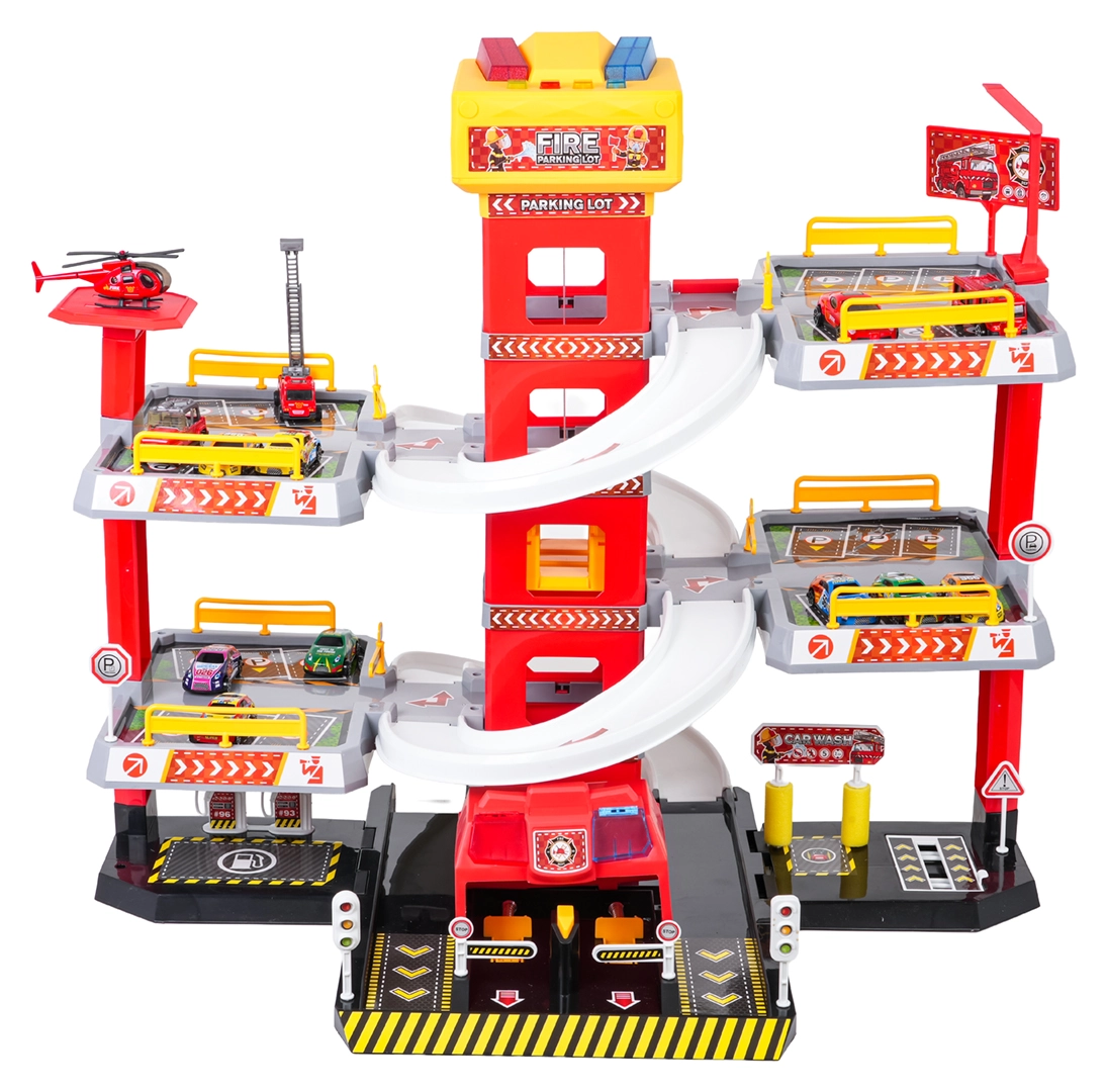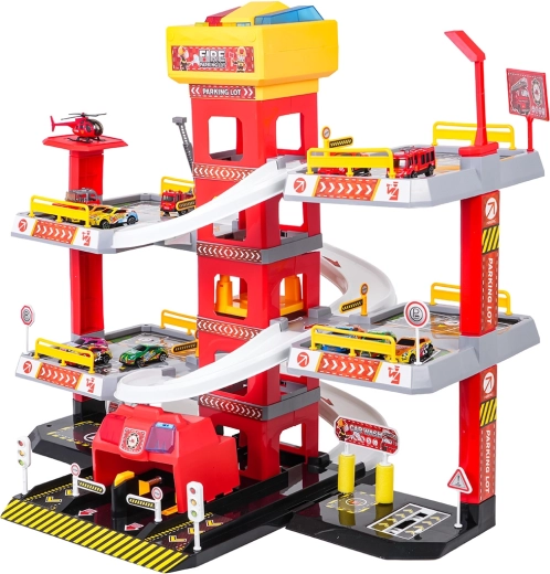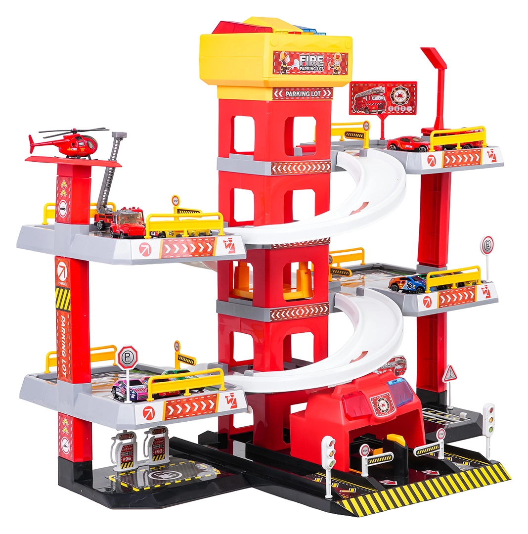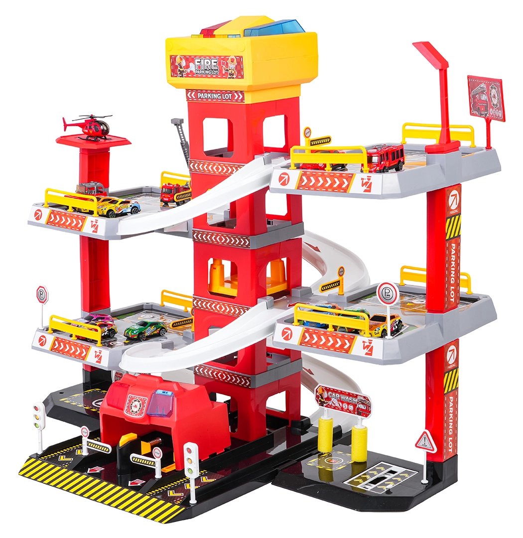 Această parcare mare de pompieri, pe 3 etaje, oferă copiilor un joc realist și plin de acțiune. Datorită turnului central cu lift, mașinuțele se pot deplasa comod între etaje sau pot aluneca în viteză pe rampele curbe. Panoul superior al liftului este echipat cu butoane mari pentru control sus/jos și patru butoane mai mici pentru efecte – sunete de pornire, mers înapoi, accelerare, frânare și melodie, completate de lumini intermitente.