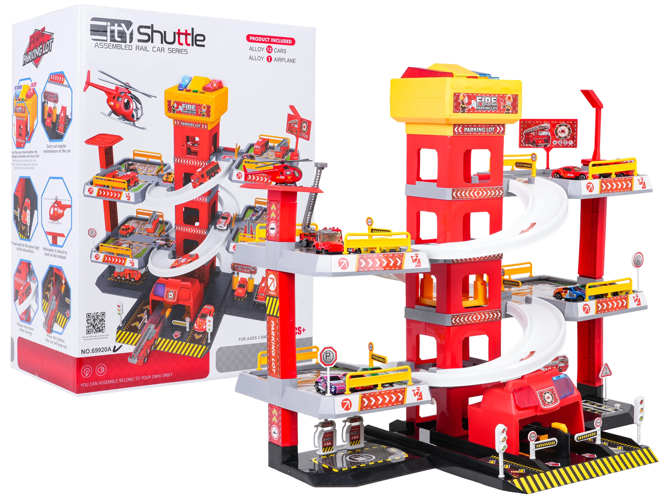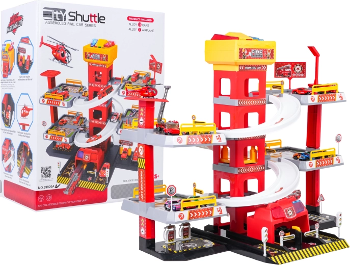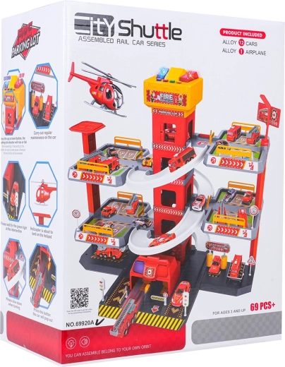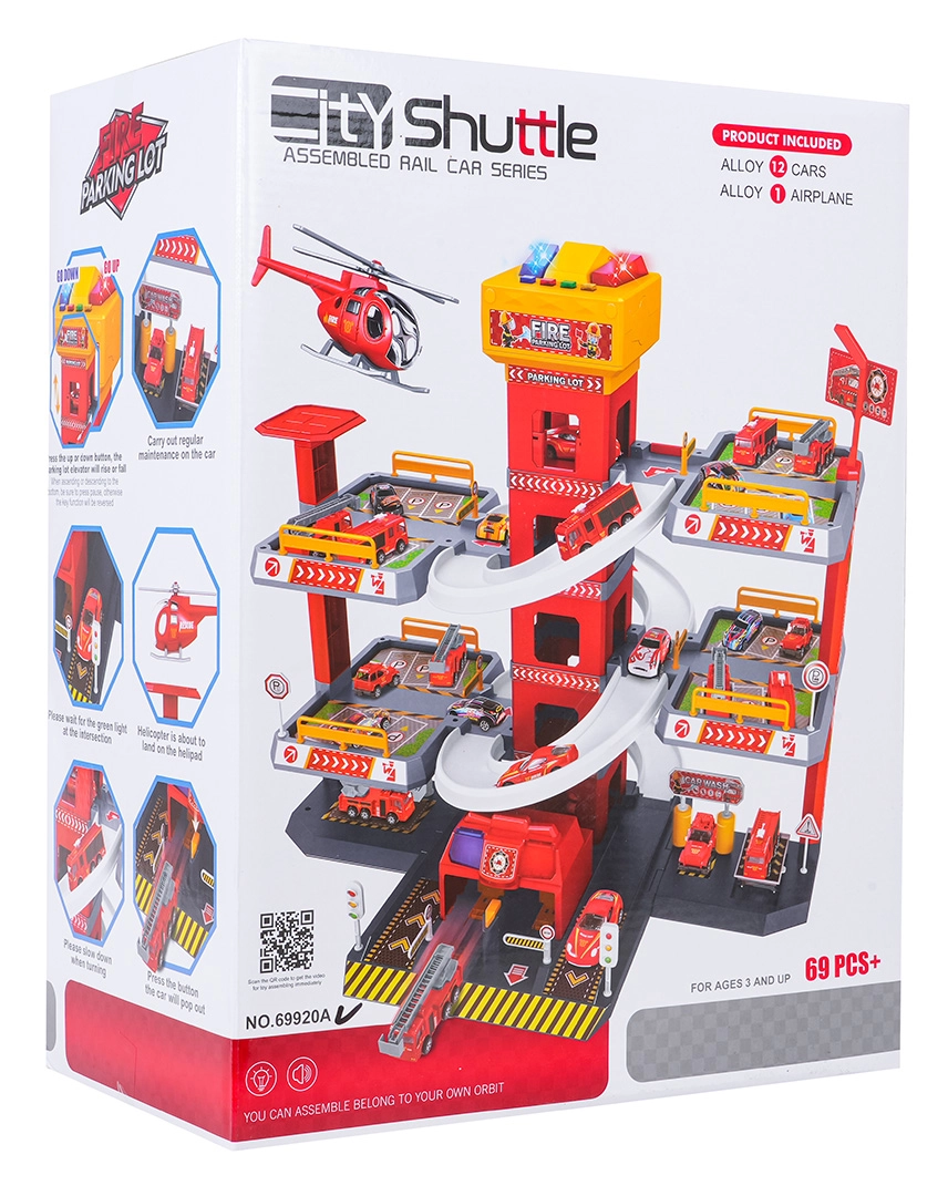 Această parcare mare de pompieri, pe 3 etaje, oferă copiilor un joc realist și plin de acțiune. Datorită turnului central cu lift, mașinuțele se pot deplasa comod între etaje sau pot aluneca în viteză pe rampele curbe. Panoul superior al liftului este echipat cu butoane mari pentru control sus/jos și patru butoane mai mici pentru efecte – sunete de pornire, mers înapoi, accelerare, frânare și melodie, completate de lumini intermitente.