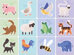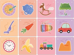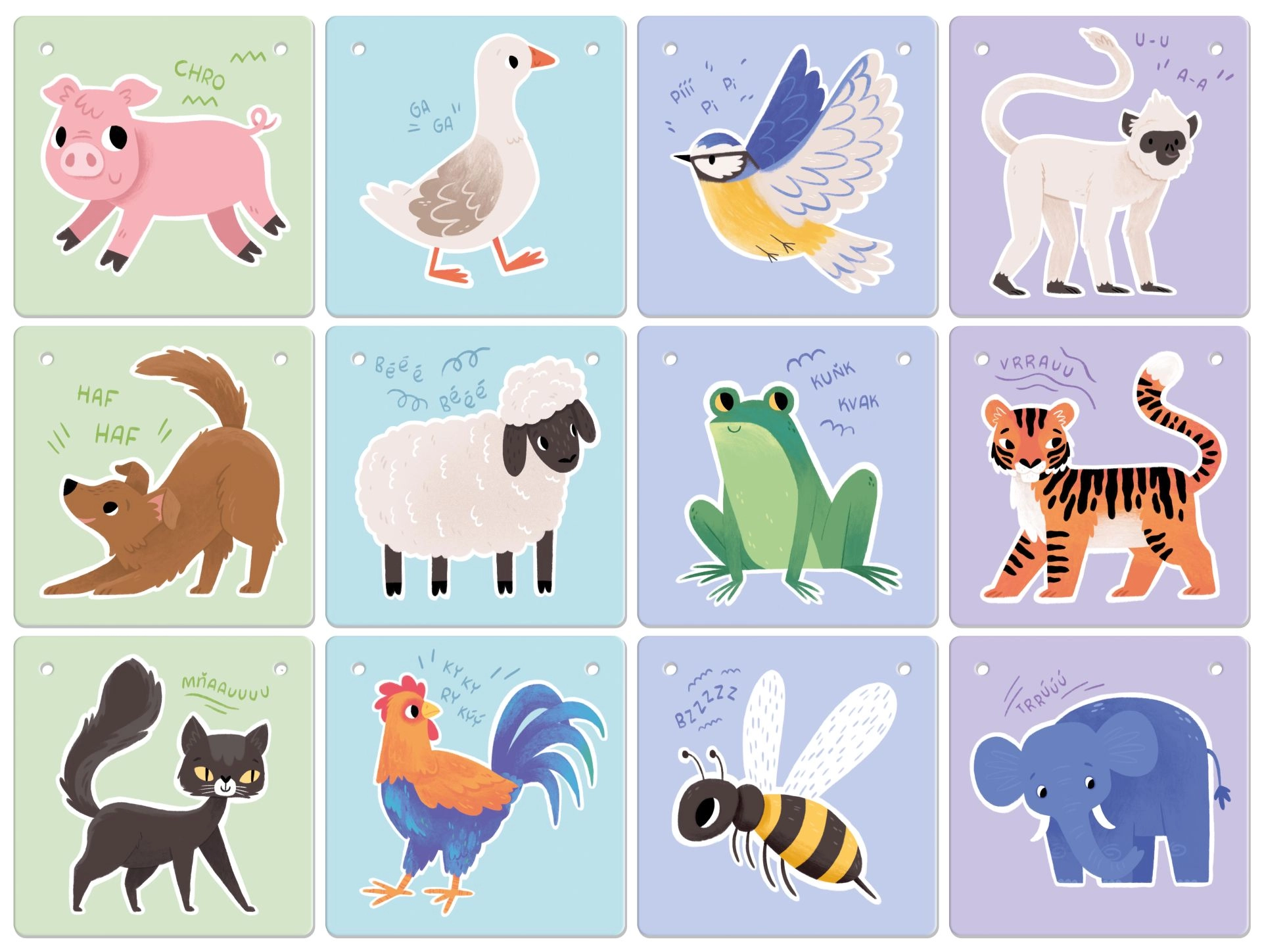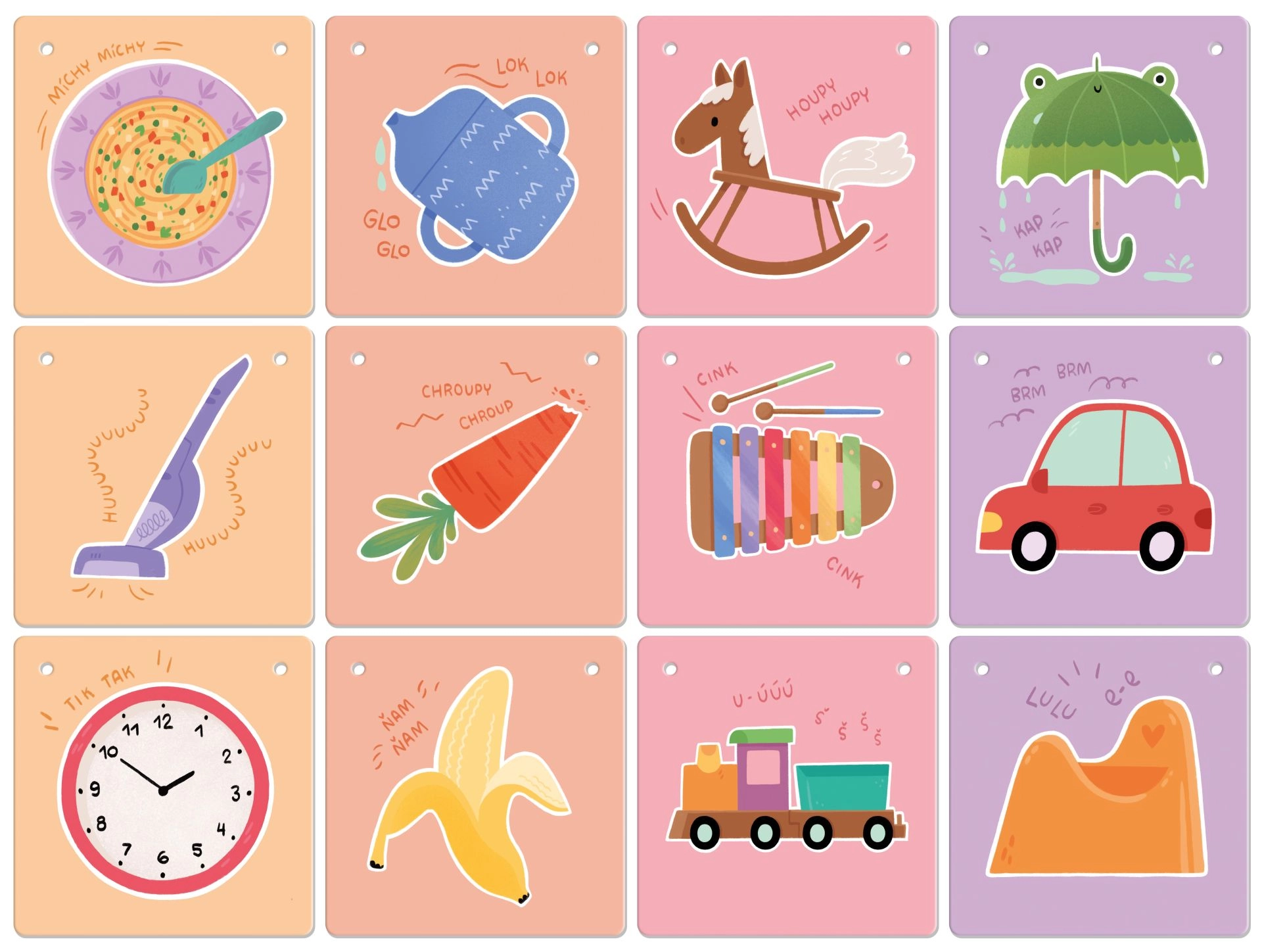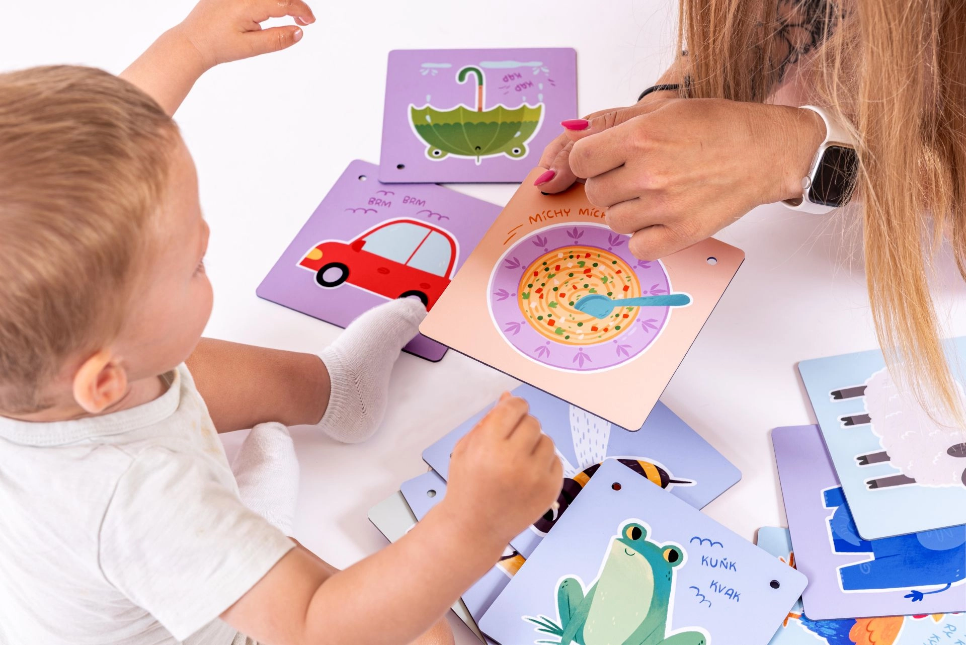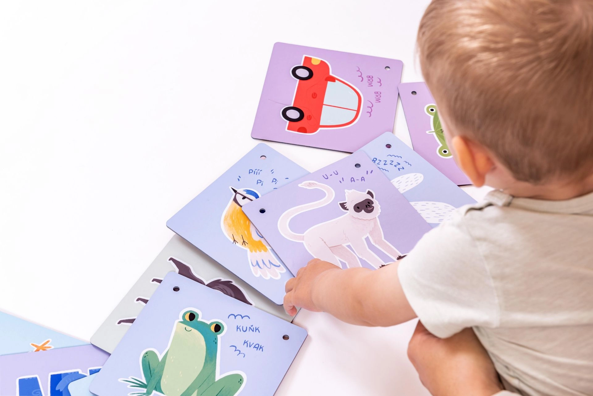 Acest set de carduri de mari dimensiuni este conceput pentru stimularea ludică a vorbirii în perioada în care copiii întâi imită sunete și abia apoi formează cuvinte. Ilustrațiile clare și ușor de înțeles, cu ghidaj grafic, îi motivează pe copii să repete sunete precum „miau”, „brrm” sau „ham”, antrenând firesc discriminarea auditivă, memoria și ritmul limbii.