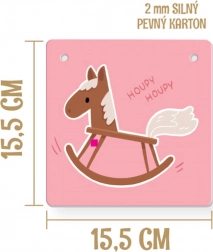 Fiecare card are dimensiunea de 15,5 × 15,5 cm și este realizat din carton FSC de 2 mm, fără plastic – ceea ce face cardurile rigide, sigure și rezistente pentru utilizarea zilnică. Setul conține 12 carduri față-verso (în total 24 de motive: 12 animale + 12 obiecte), inclusiv sfaturi pentru părinți cu idei de jocuri și activități de dezvoltare.
