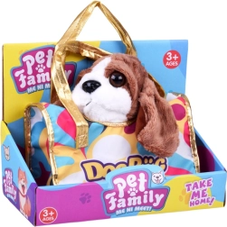 Poșeta colorată cu mânere aurii permite copiilor să ia cățelul oriunde – la plimbare, la grădiniță și în călătorii.