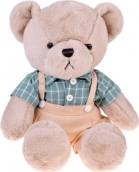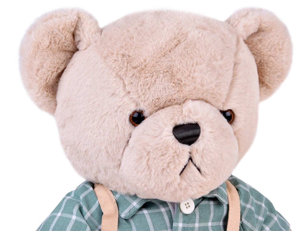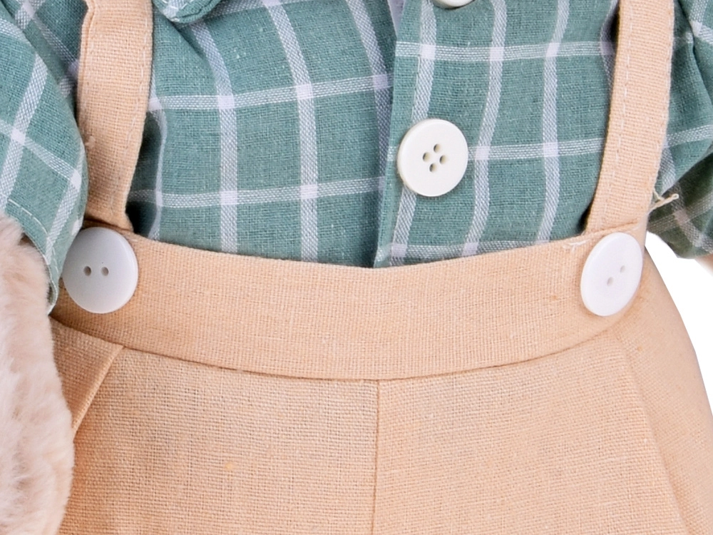 Ursulețul Franek îmbină finețea cu designul atemporal. Plușul său mătăsos invită la îmbrățișare, iar trăsăturile discrete, brodate, creează o expresie drăgălașă și universală. Cămașa verde stilată cu carouri albe și șortul deschis la culoare cu bretele oferă oricărei camere o atmosferă primitoare.