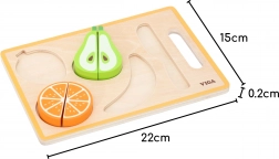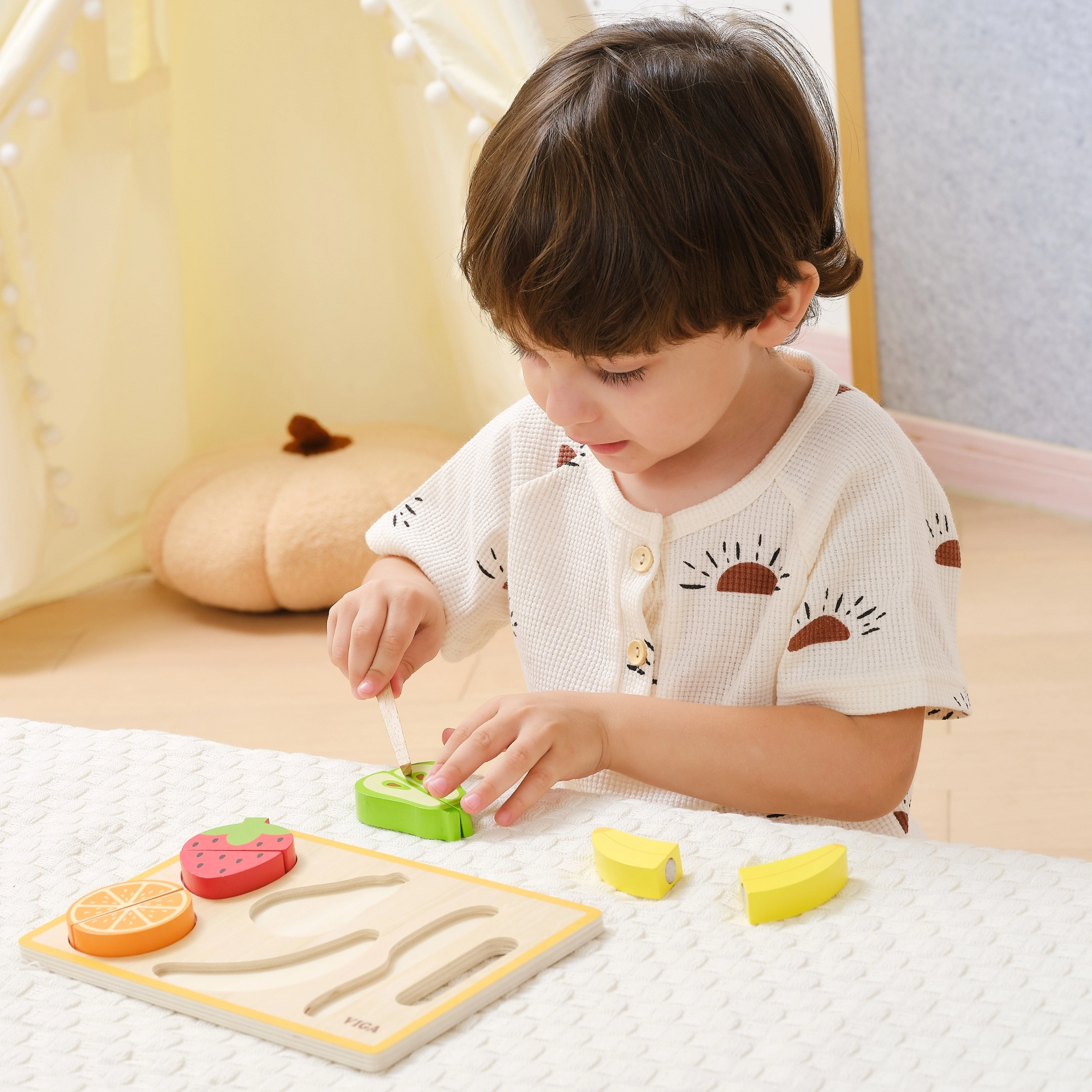 Fiecare fruct este împărțit în segmente unite cu arici, care oferă la tăiere un sentiment și un sunet autentic. Excelent pentru exersarea coordonării mână–ochi.