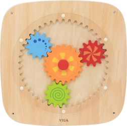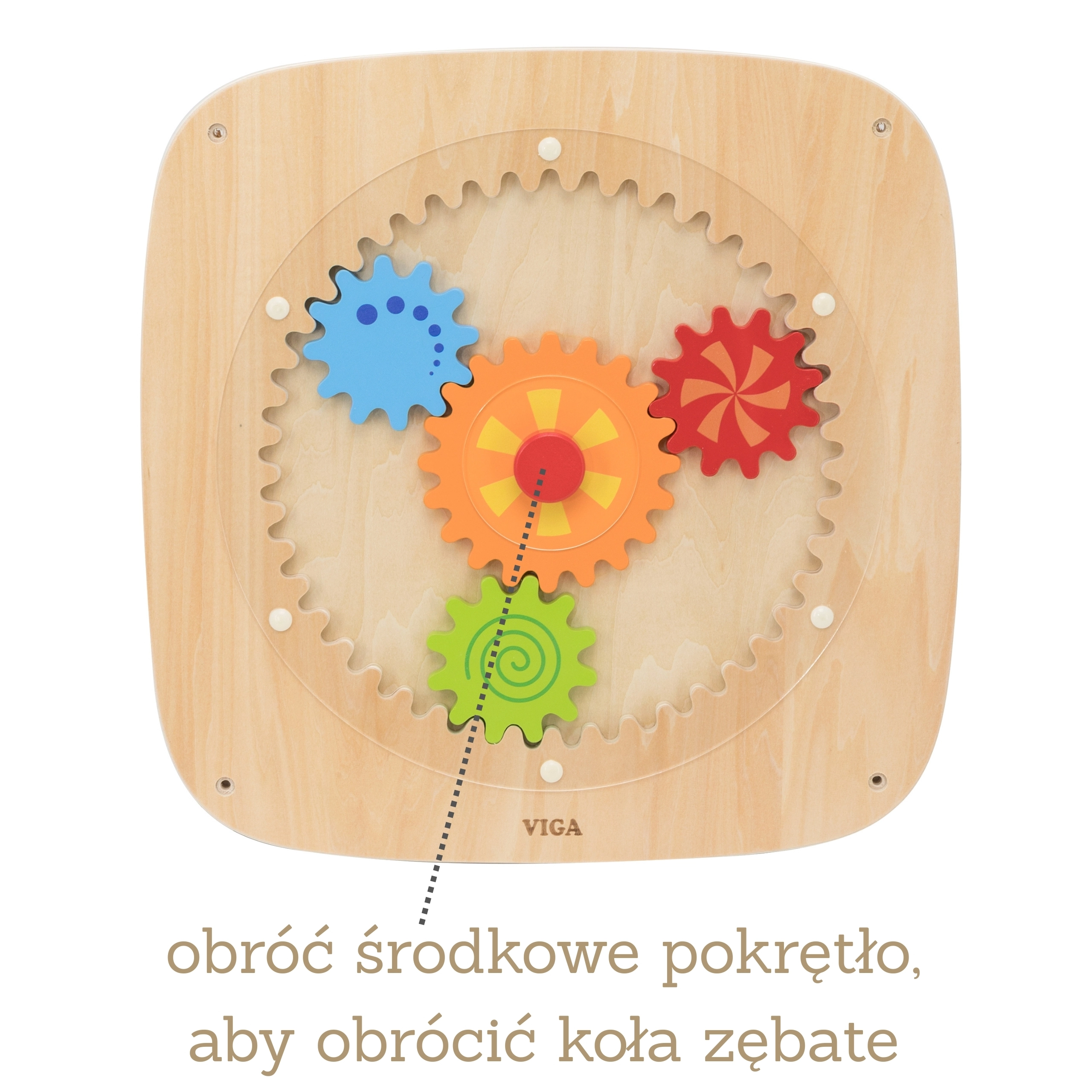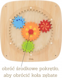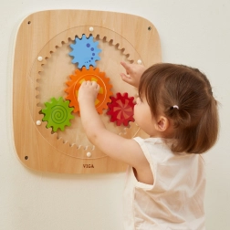 Acest tablou de perete din lemn cu roți dințate colorate este conceput pentru a le oferi copiilor plăcerea descoperirii. Prin rotirea rotiței centrale se pun în mișcare toate angrenajele simultan, ilustrând natural principiile forței, mișcării și relațiilor cauzale. Culorile și modelele diferite de pe roți generează, la rotire, efecte vizuale atrăgătoare.