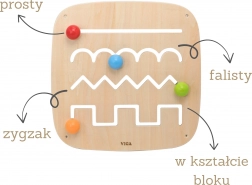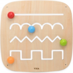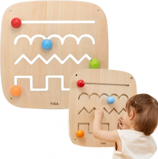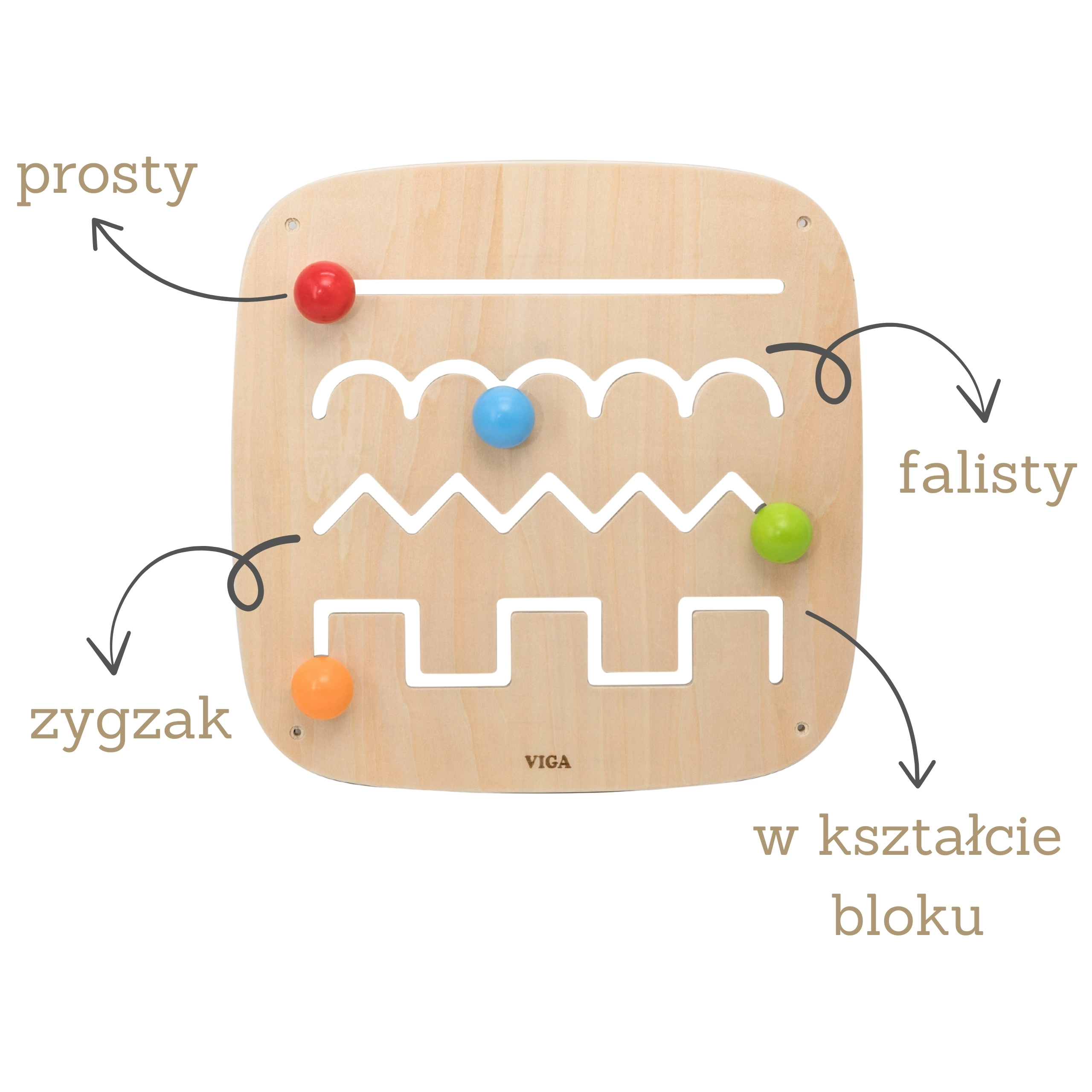 Tabla din lemn VIGA transformă joaca zilnică într-o activitate plină de sens. Copiii mută bilele pe diferite trasee, explorează linii drepte, valuri, zig‑zaguri și forme tip bloc, exersează priza, precizia mișcării și învață concepte precum curbe și unghiuri. Lemnul natural, colțurile rotunjite și prinderea solidă asigură siguranță la fiecare atingere.
