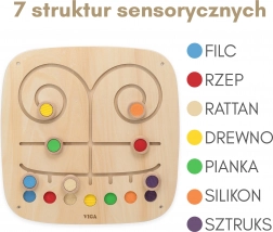 Șapte texturi unice și culori puternice îi ghidează pe copii să distingă suprafețe, culori și forme, întărind natural percepția senzorială și concentrarea.