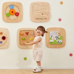 Datorită execuției robuste din lemn și marginilor rotunjite, jucăria este durabilă și sigură pentru utilizare zilnică. Instalarea pe perete economisește spațiul și susține un mediu organizat, fără piese libere pe podea.
