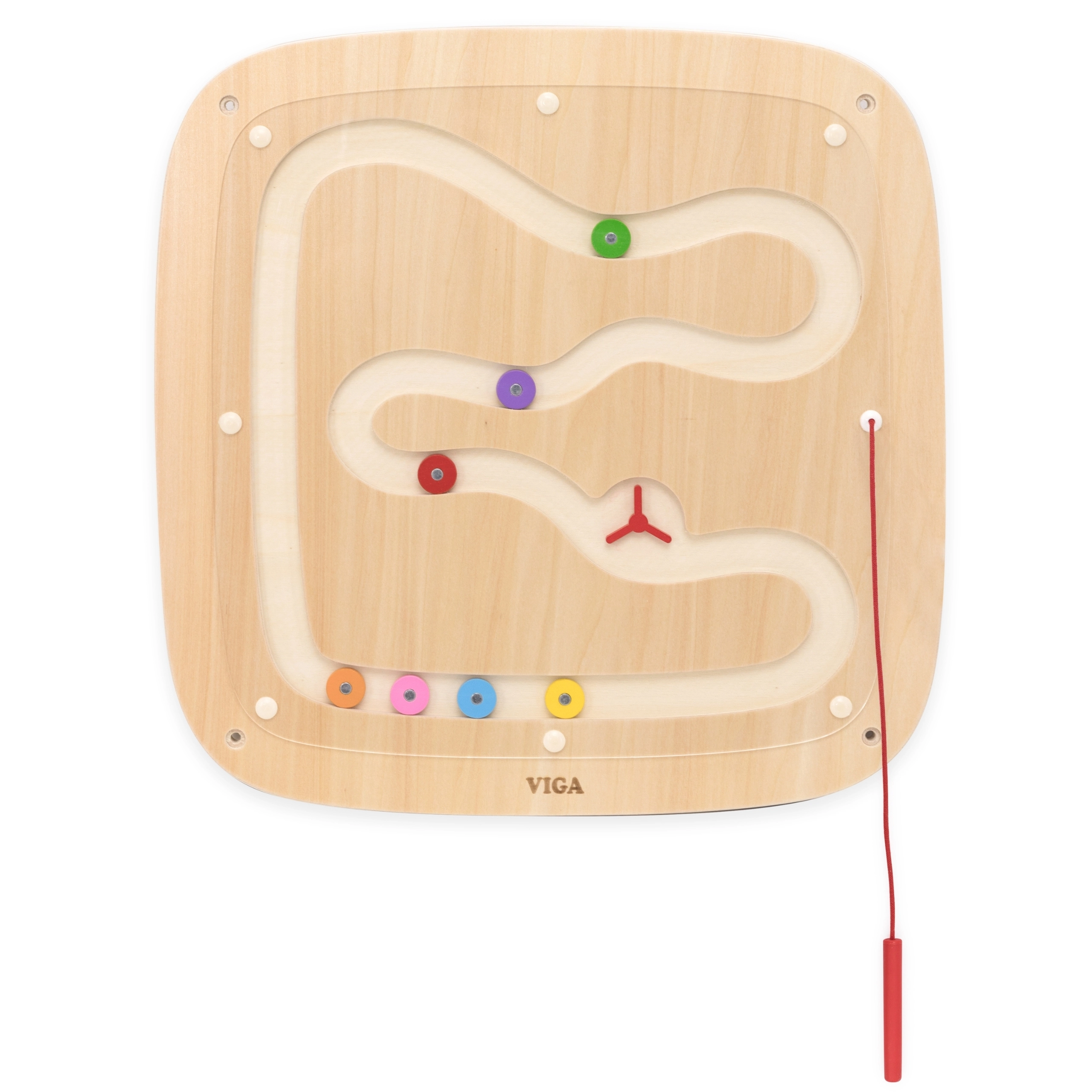 Descoperă magia gravitației cu această tablă interactivă din lemn VIGA! Cu ajutorul stiloului magnetic atașat, copiii deplasează discurile colorate pe două trasee diferite și observă cum se schimbă viteza și direcția. Tabloul este rezistent, sigur și montabil pe perete, economisind spațiu și dezvoltând motricitatea fină, coordonarea ochi–mână și gândirea logică.