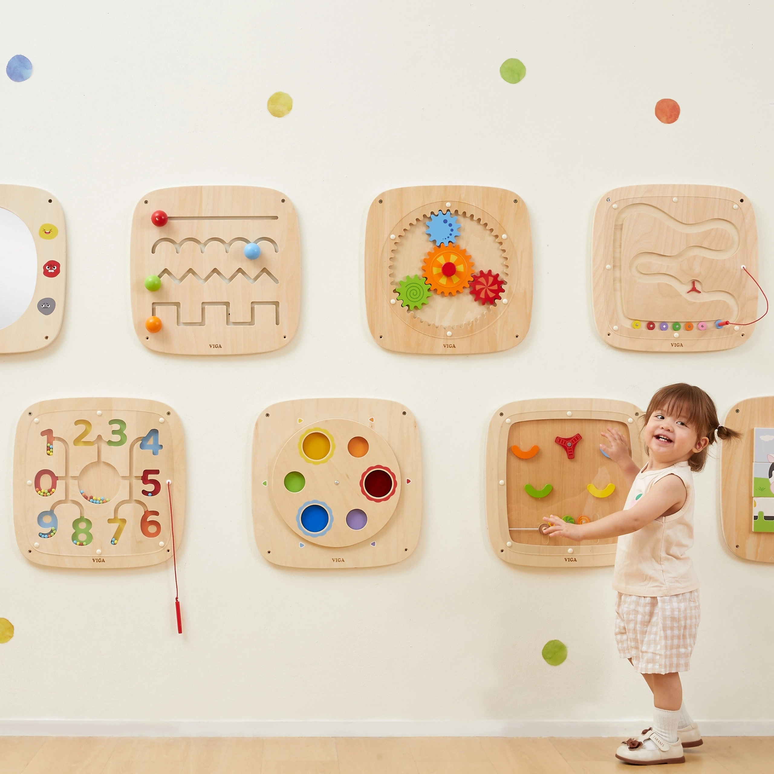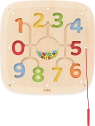 Descoperă lumea jucăușă a numerelor și culorilor cu tabla de perete din lemn VIGA. Cu ajutorul stiloului magnetic, copiii deplasează biluțele în labirintul magnetic și exersează număratul, recunoașterea numerelor și culorilor, precum și motricitatea fină. Datorită montajului pe perete, economisește spațiu și oferă un design sigur și durabil pentru joaca de zi cu zi.