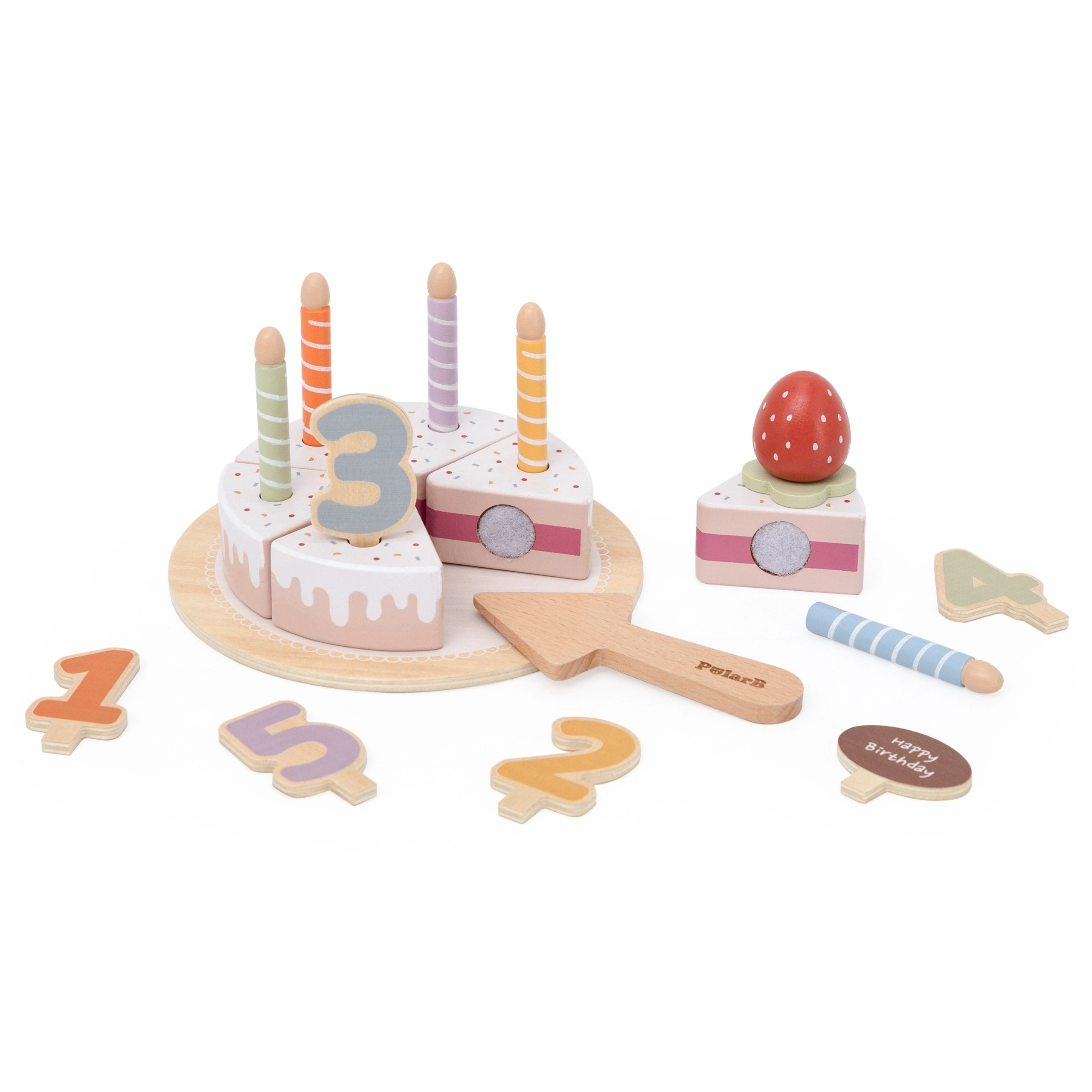Tortul aniversar din lemn Viga transformă camera copilului într-o petrecere. Cele șase felii se unesc cu ajutorul ariciului, astfel încât copiii se bucură de o tăiere și servire realistă. Lumânările, cifrele și decorațiunile detașabile stimulează imaginația, comunicarea și cooperarea în jocul împreună.