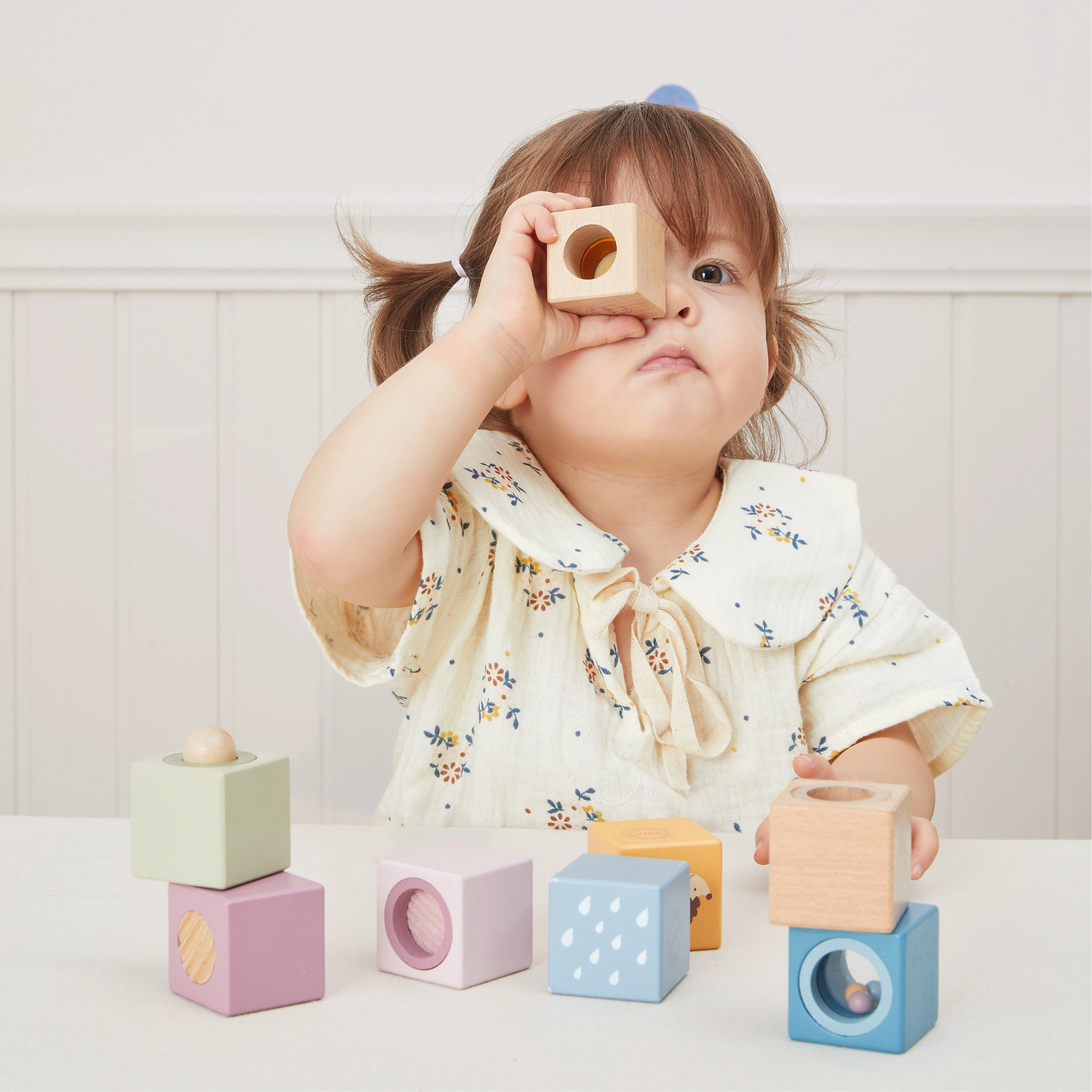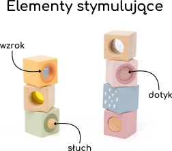 Fiecare cub are un element unic pentru stimulare multisenzorială – de la oglindă și zornăitoare până la structuri tactile. Datorită dimensiunilor prietenoase, se prind ușor, dezvoltă coordonarea mână–ochi, motricitatea fină și susțin jocul liber creativ.