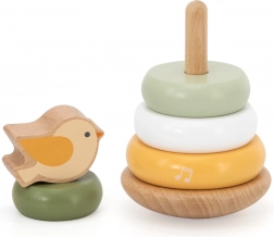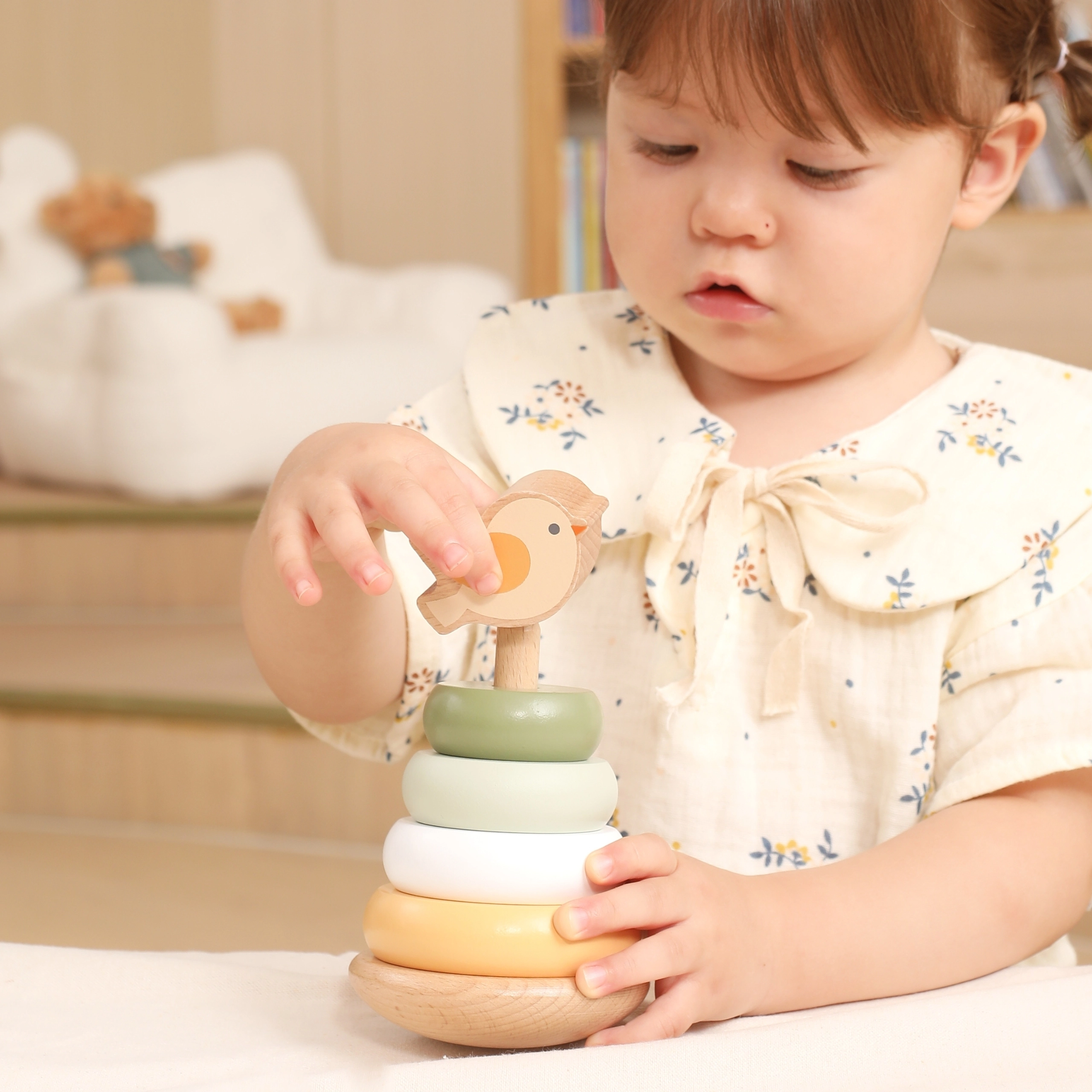 Turnul de stivuire din lemn, cu o păsăreluță simpatică în vârf, îi va încânta pe toți micuții. Inelele colorate, cu margini netede, sunt ușor de prins și de aranjat în ordine variată, sprijinind distincția culorilor și mărimilor precum și rezolvarea de probleme. Baza stabilă și formele plăcut rotunjite asigură o manipulare sigură pentru mâini mici.