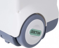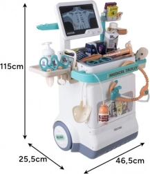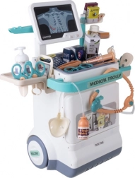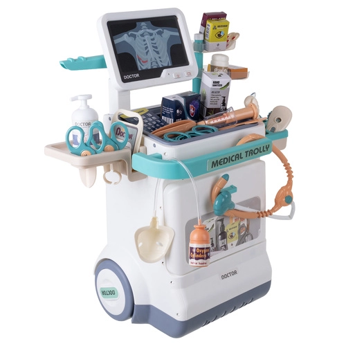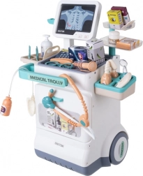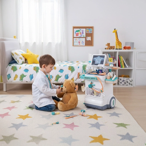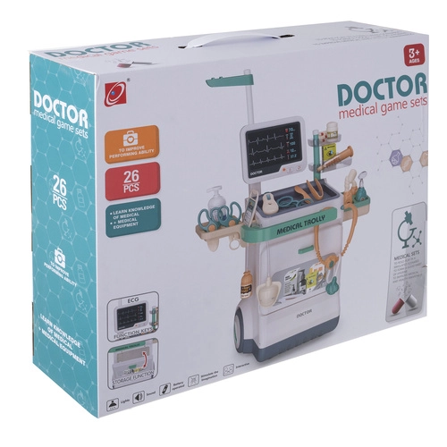 Stația medicală pentru copii mobilă aduce acasă jocul realist de-a doctorul. Căruciorul pe două niveluri, cu roți, ecran EKG/RTG și dotare bogată, le permite copiilor să îngrijească pacienții – plușuri sau membri ai familiei. Efectele luminoase și sonore (bătăi ale inimii, semnal EKG) stimulează curiozitatea și explică funcționarea cabinetului.