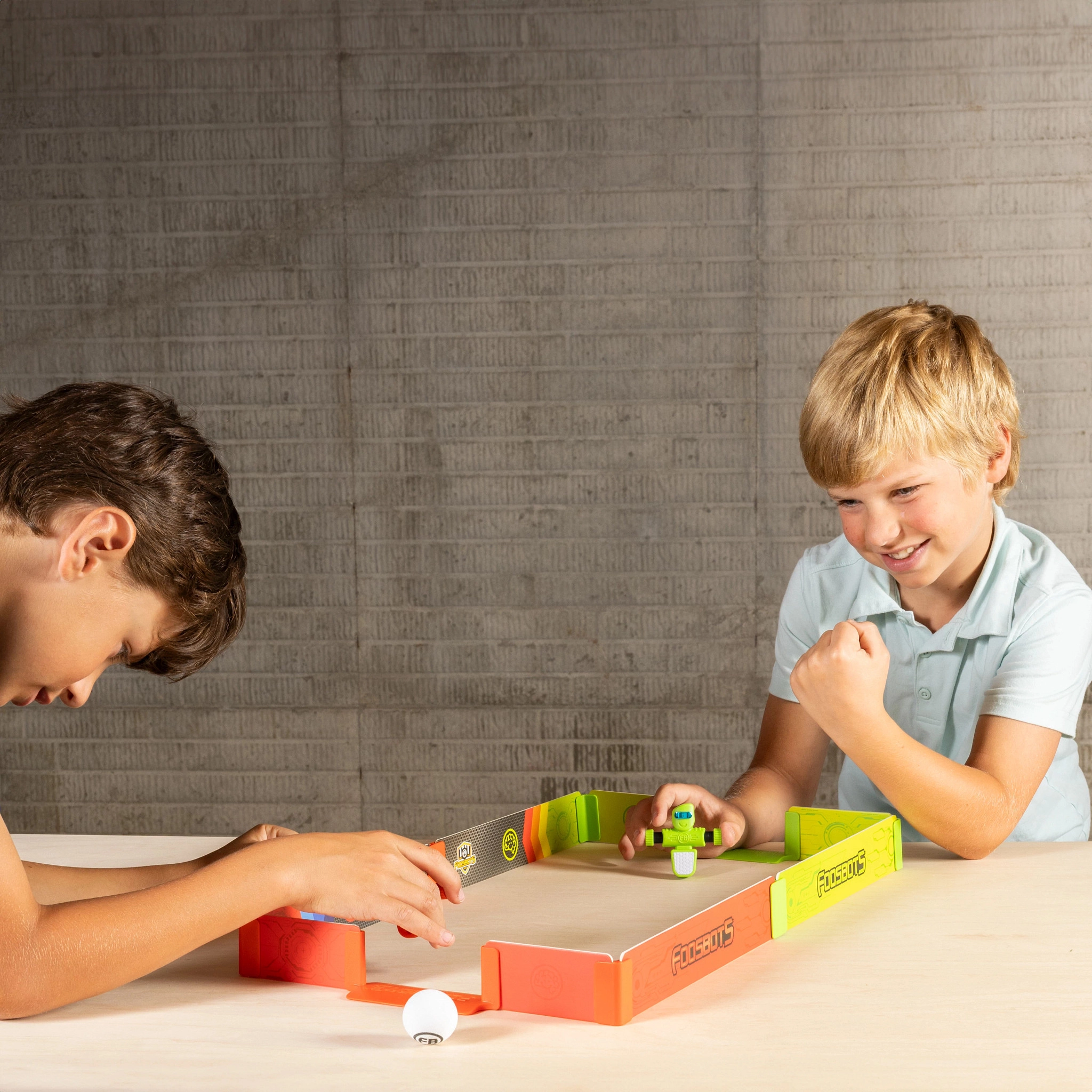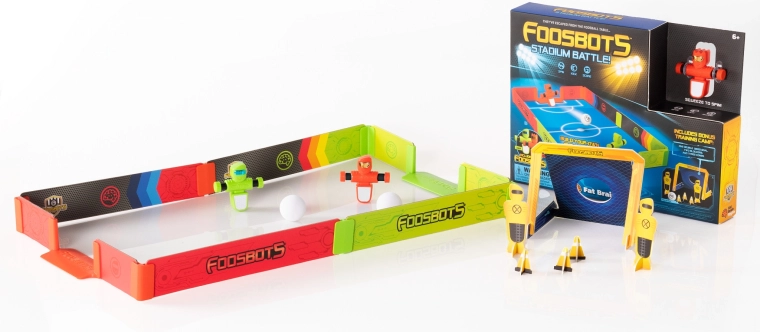 Foosbots bătălia de pe stadion aduce în living ritmul alert al fotbalului de masă într-un format de buzunar. Datorită mantinelelor colorate, porților încorporate și perechii de roboți de deget, pornești ușor un duel unu la unu. Controlează-ți „boții” cu degetele îndemânatice, șutează mingea albă și apără poarta într-un tempo fulgerător.