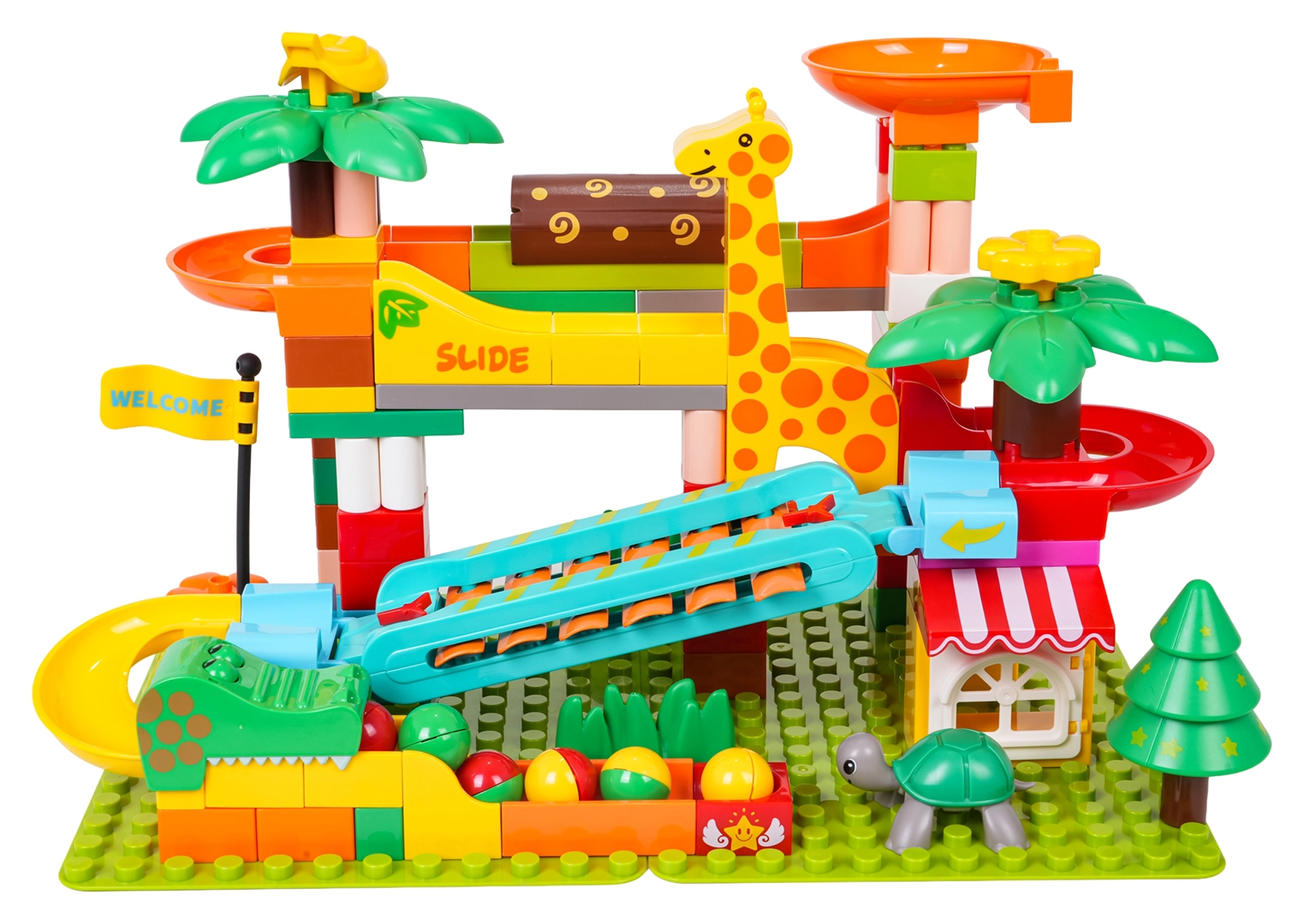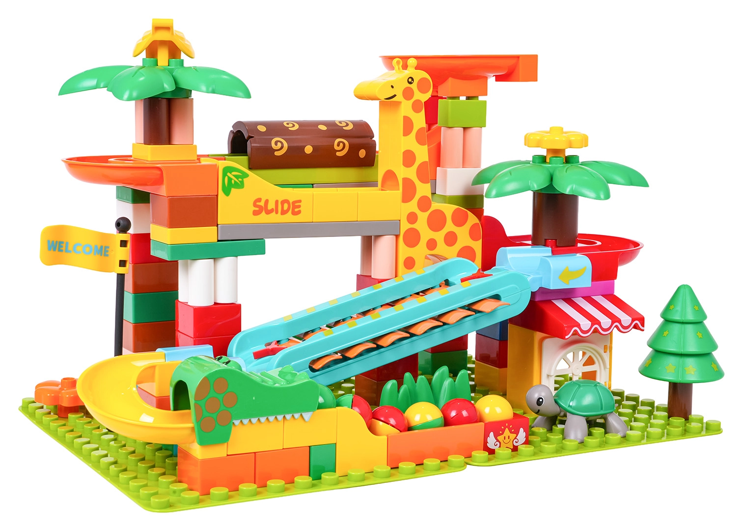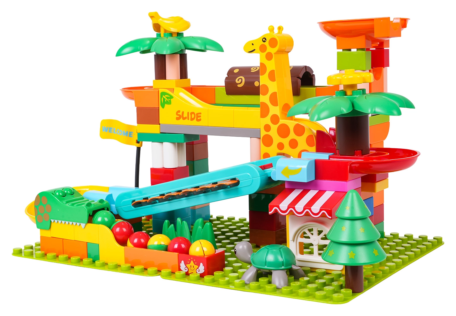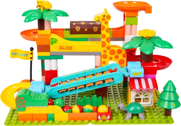 Rampe colorate, pâlnii și tobogane cu decoruri de palmieri și animăluțe invită la construirea mereu a unor trasee noi.