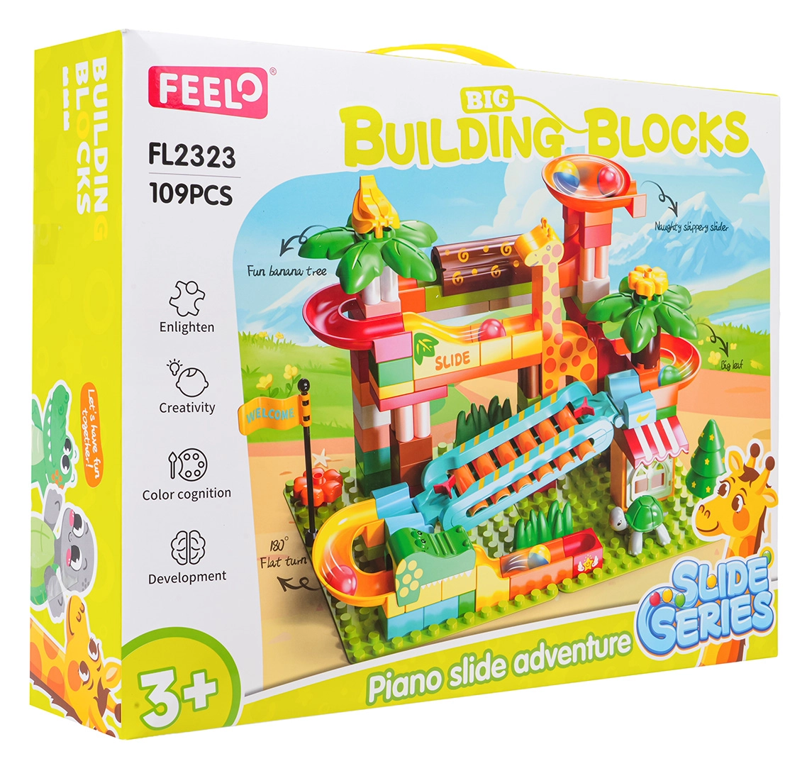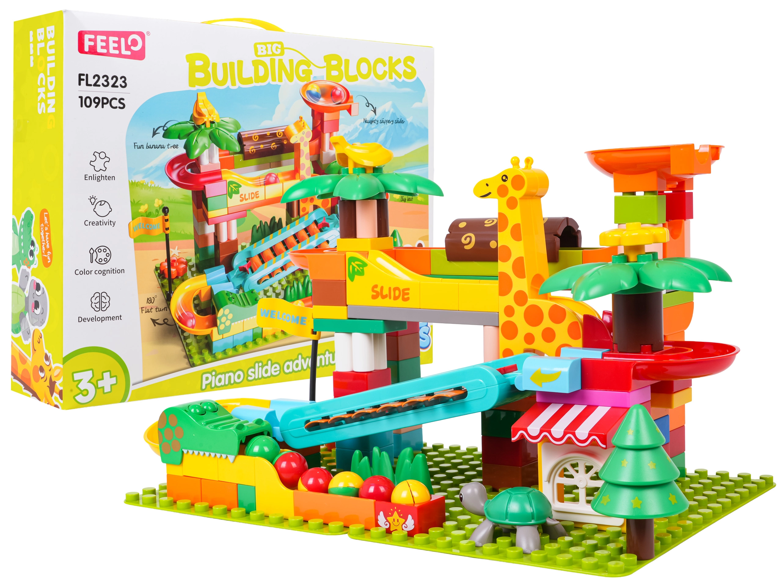 Acest set creativ aduce în camera copilului atmosfera safari: palmieri, animăluțe și căsuță, completate de o pistă de bile ingenioasă cu tobogane, pâlnii și element tip pian – când bilele trec peste xilofon, creează melodii vesele. Baza stabilă și prinderea ușoară a pieselor garantează construirea și joaca fără griji.
