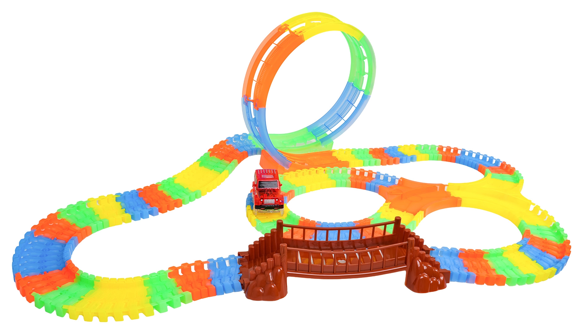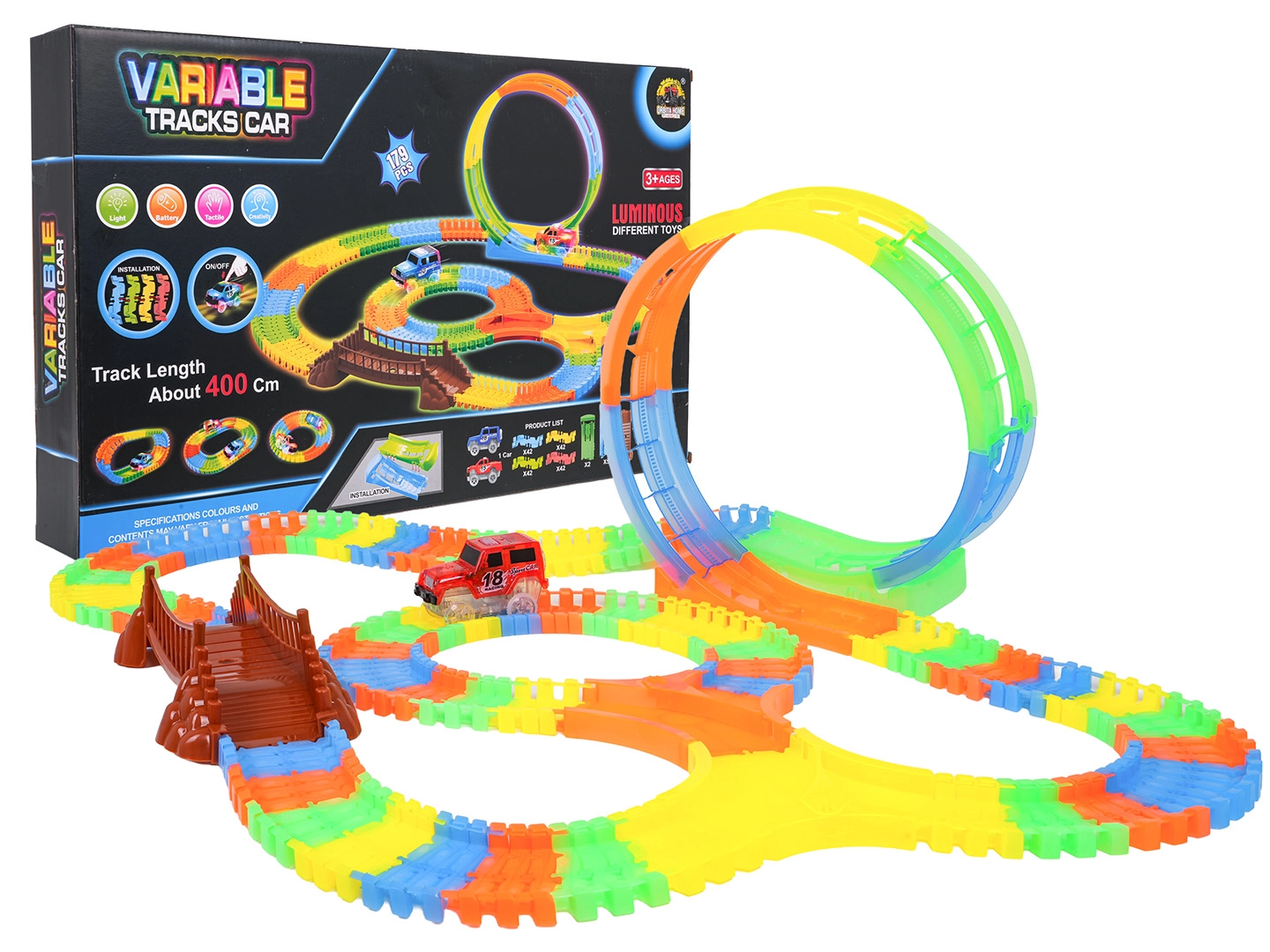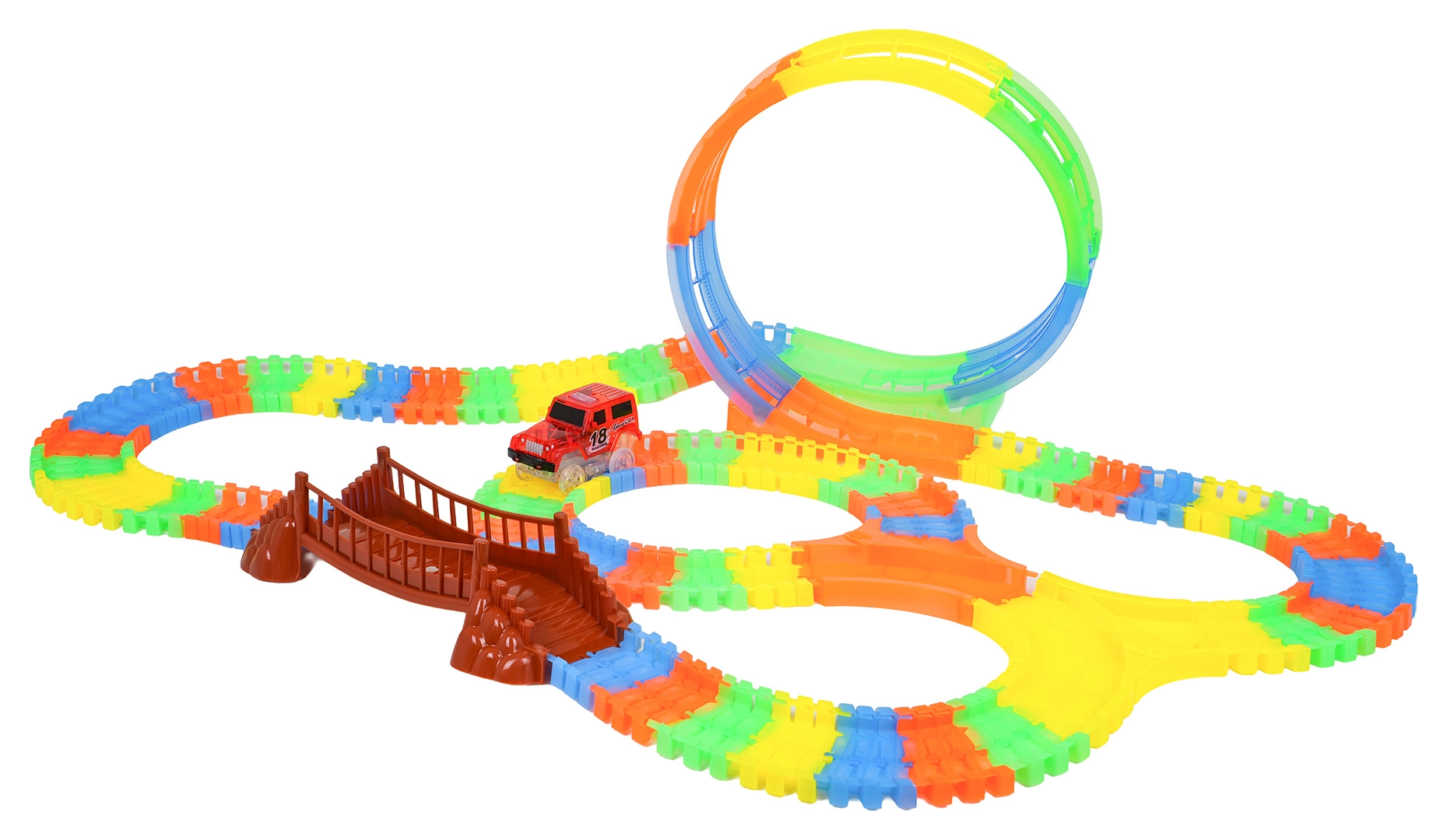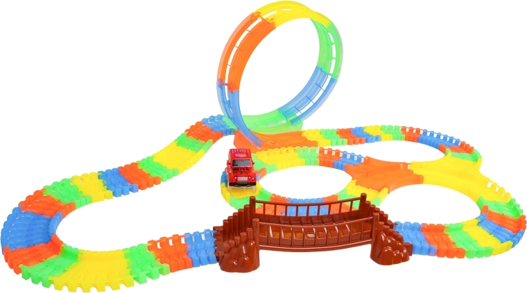 Această pistă auto colorată îi va încânta pe copii de la 3 ani. Datorită segmentelor flexibile, puteți construi linii drepte, curbe, pod și o mare buclă verticală – în doar câteva clipe. Execuția fluorescentă asigură efectul de strălucire în întuneric, în timp ce mașinuța cu LED străbate traseul lăsând o dâră luminoasă.