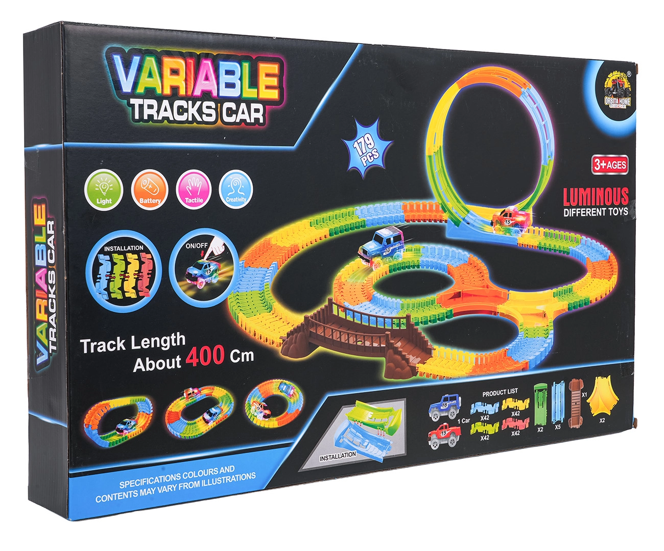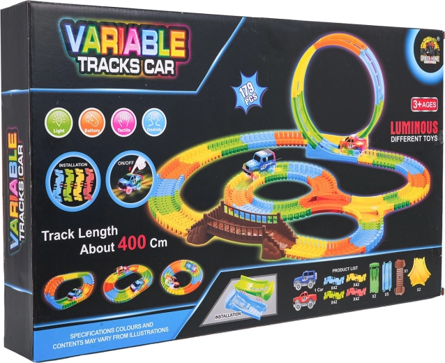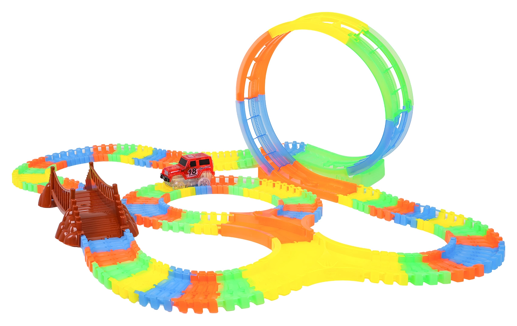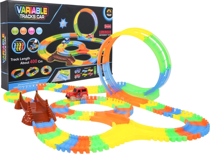 Această pistă auto colorată îi va încânta pe copii de la 3 ani. Datorită segmentelor flexibile, puteți construi linii drepte, curbe, pod și o mare buclă verticală – în doar câteva clipe. Execuția fluorescentă asigură efectul de strălucire în întuneric, în timp ce mașinuța cu LED străbate traseul lăsând o dâră luminoasă.