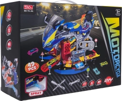 - 2‑în‑1: motocicletă și atelier – deschide panourile și începe „servisul”