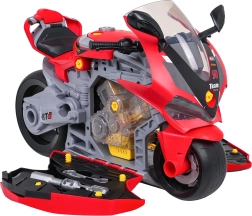 Această jucărie inteligent concepută combină o motocicletă pentru joacă imaginativă și un atelier mecanic pentru micii meșteri. La deschiderea panourilor laterale se dezvăluie pistoanele iluminate ale motorului, care pot fi scoase și explorate. Copiii învață prin joc principiile de bază ale funcționării unui mecanism, dezvoltând totodată motricitatea fină și îndemânarea.